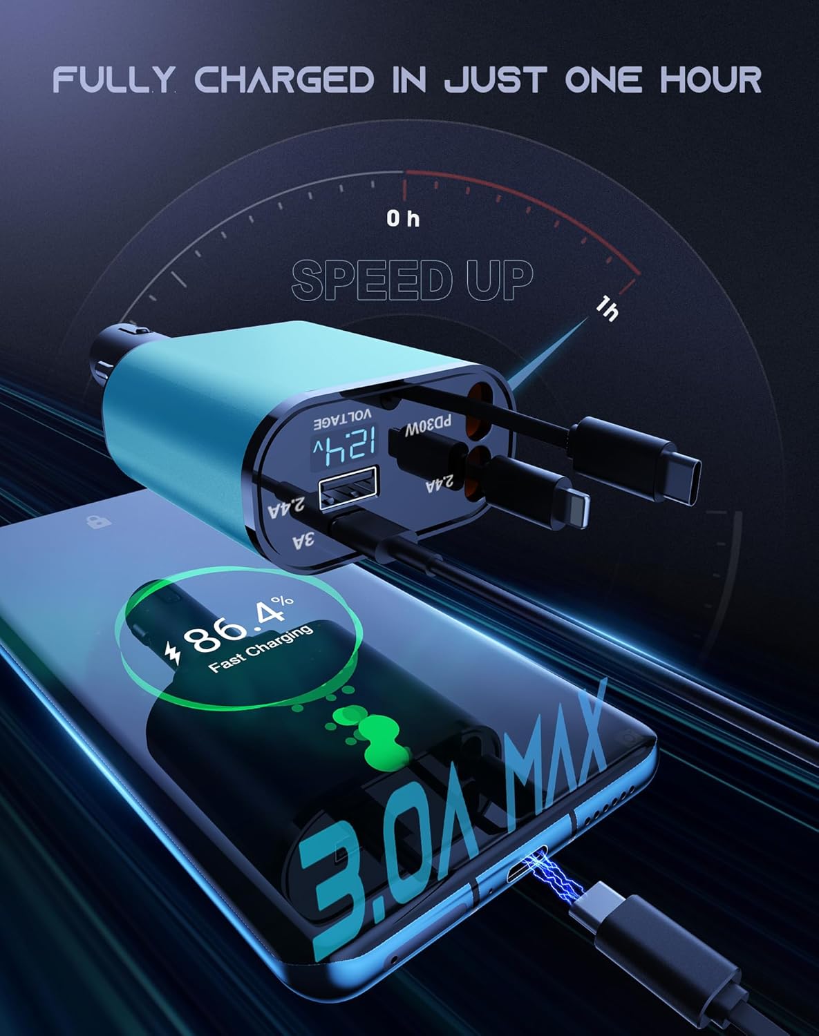 - ZERO CLUTTER & FLEXIBLE 180° ADJUSTABLE - The car cigarette lighter charger is equipped with innovative built-in retractable cords, extending up to 80cm (2.6ft) to reach any seat with a simple pull, and neatly retracts back after use. Plus, the head of this car charger adapter can be adjusted up to 180° left or right for added flexibility. No more tangled cables and cluttered dashboards!
