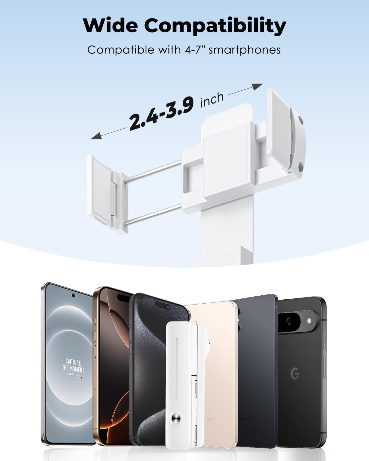 - 【Wide Compatibility Selfie Stick】This versatile selfie stick is designed to work with smartphones between 4 and 7 inches, Compatible with iPhone 16/15/14/X/12/13/13 Plus and Pro, Galaxy S10, LG G7, Ulefone Note 6, and more. The adjustable pull clip ranges from 2.4 to 3.9 inches, allows you to rotate the phone horizontally and vertically. Whether you’re using it as a selfie stick for iPhone, a mini selfie stick for seamless photos, or a photo stick for iPhone to capture stunning shots, it securely holds your device in place.