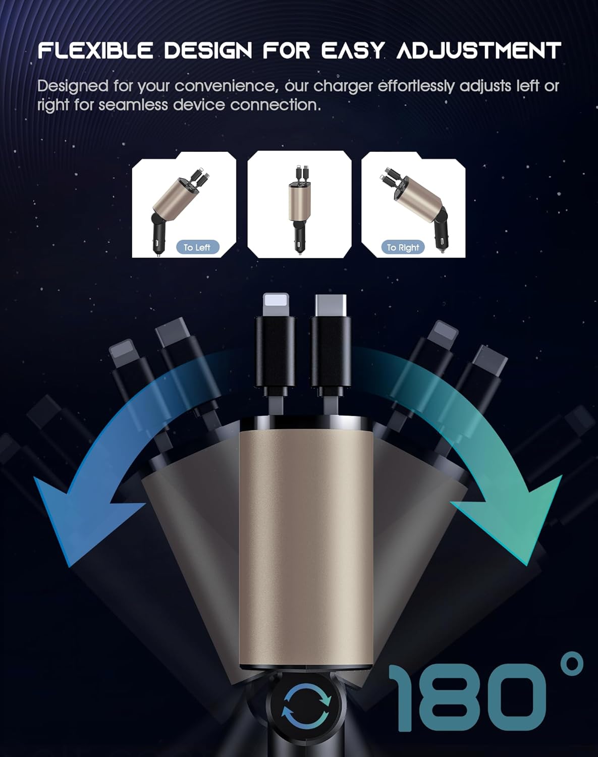 - ZERO CLUTTER & FLEXIBLE 180° ADJUSTABLE - The car cigarette lighter charger is equipped with innovative built-in retractable cords, extending up to 80cm (2.6ft) to reach any seat with a simple pull, and neatly retracts back after use. Plus, the head of this car charger adapter can be adjusted up to 180° left or right for added flexibility. No more tangled cables and cluttered dashboards!