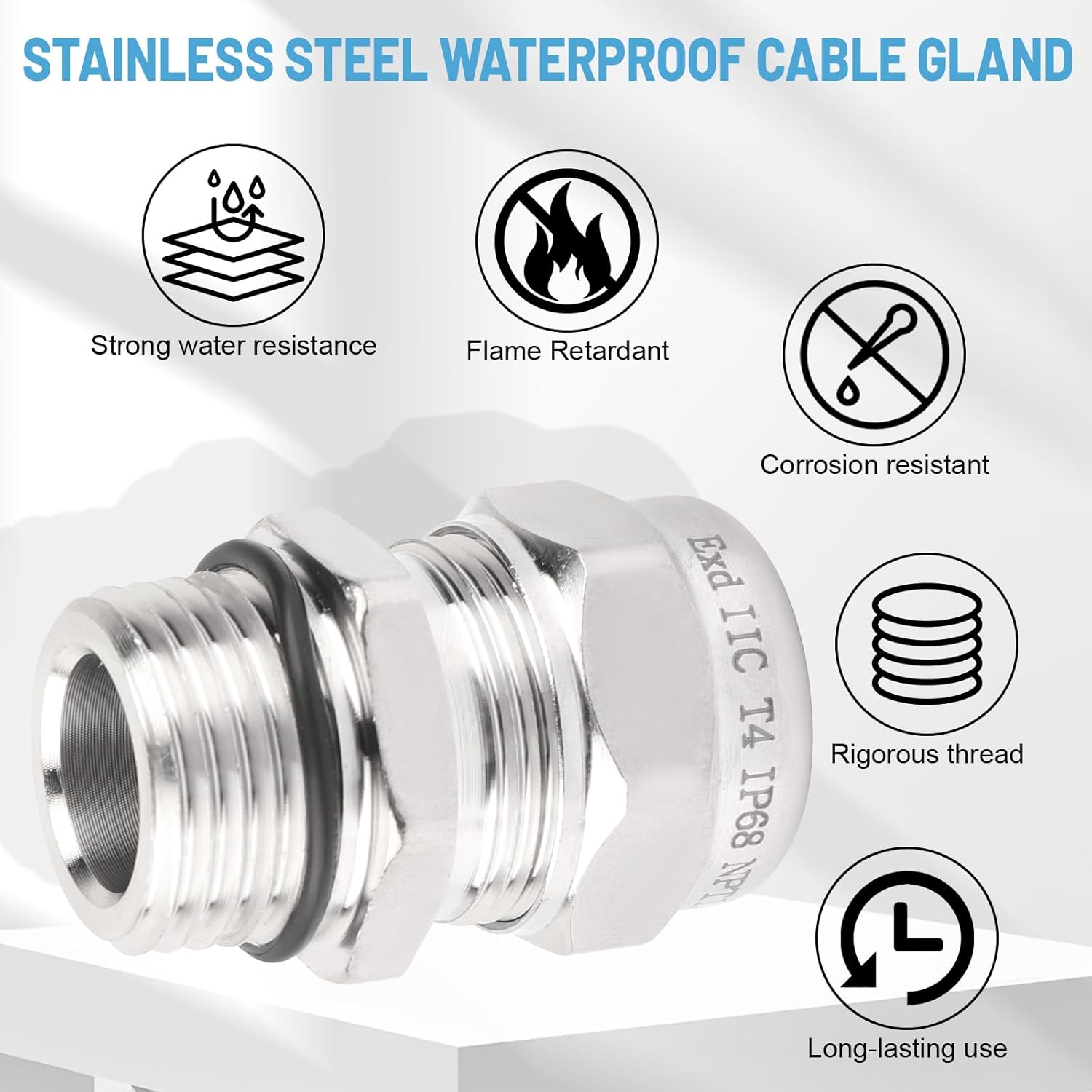 - Quality Materials: These 1/2" cable gland are made of 304 stainless steel for superior reliability and to withstand harsh environments that plastic glands cannot