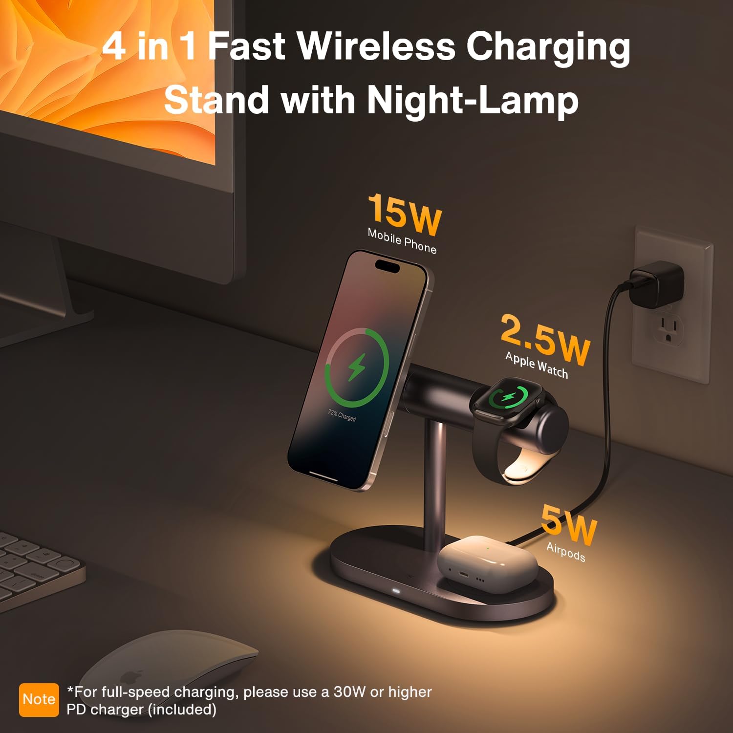 iVANKY Qi2 Certified 4 in 1 Wireless Charger Stand with Nightstand Light for MagSafe Magnetic Charging Station for iPhone 17/16 Plus Pro Max Air,Apple iWatch, Airpods (with 33 W PD Charger)