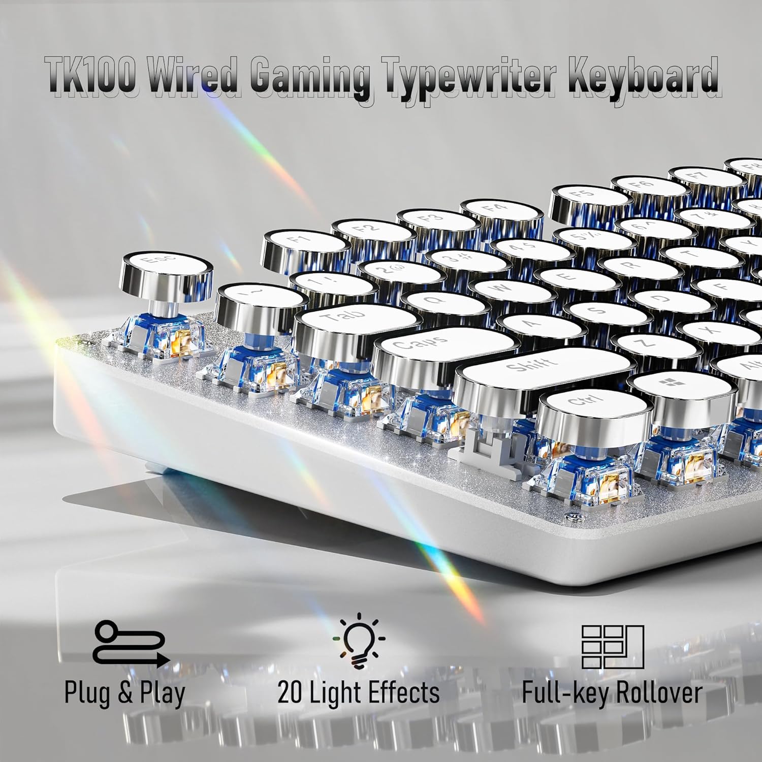 - Retro Typewriter Style Round Keycaps: The TK100 wired typewriter keyboard uses a double-shot injection retro punk round keycap with a clear backlight, which is extremely durable. Stepped floating keycaps that fit your fingertips perfectly, a precise position. Ergonomic foot support makes typing less tiring and more comfortable. The highly durable mechanical blue switch responds faster and more quickly, accompanied by a crisp click