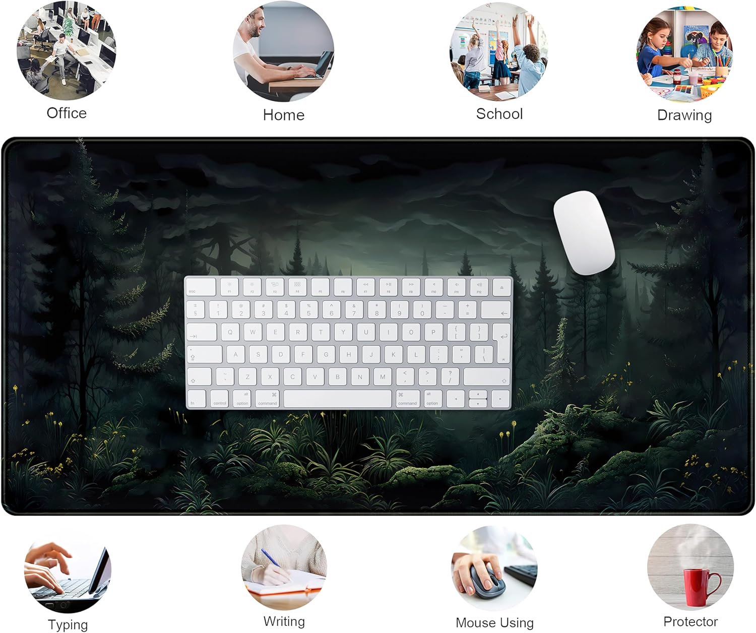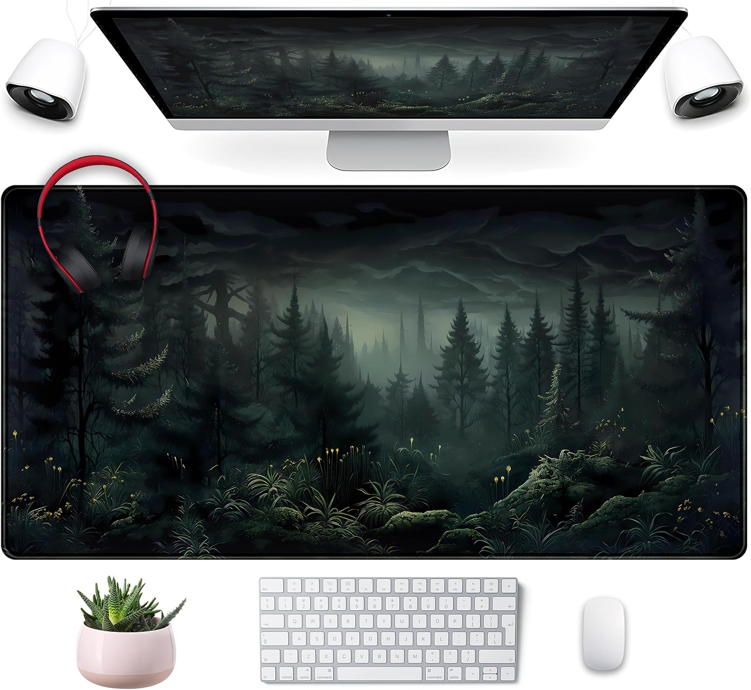 Cute Dark Gloomy Forest Desk Mat, Gothic XXL Large Extended Gaming Mouse Pad Mat, Non-Slip Rubber Base Mousepad Computer Keyboard and Mouse Mat, Desk Pad with Stitched Edges, 31.5x15.75 in