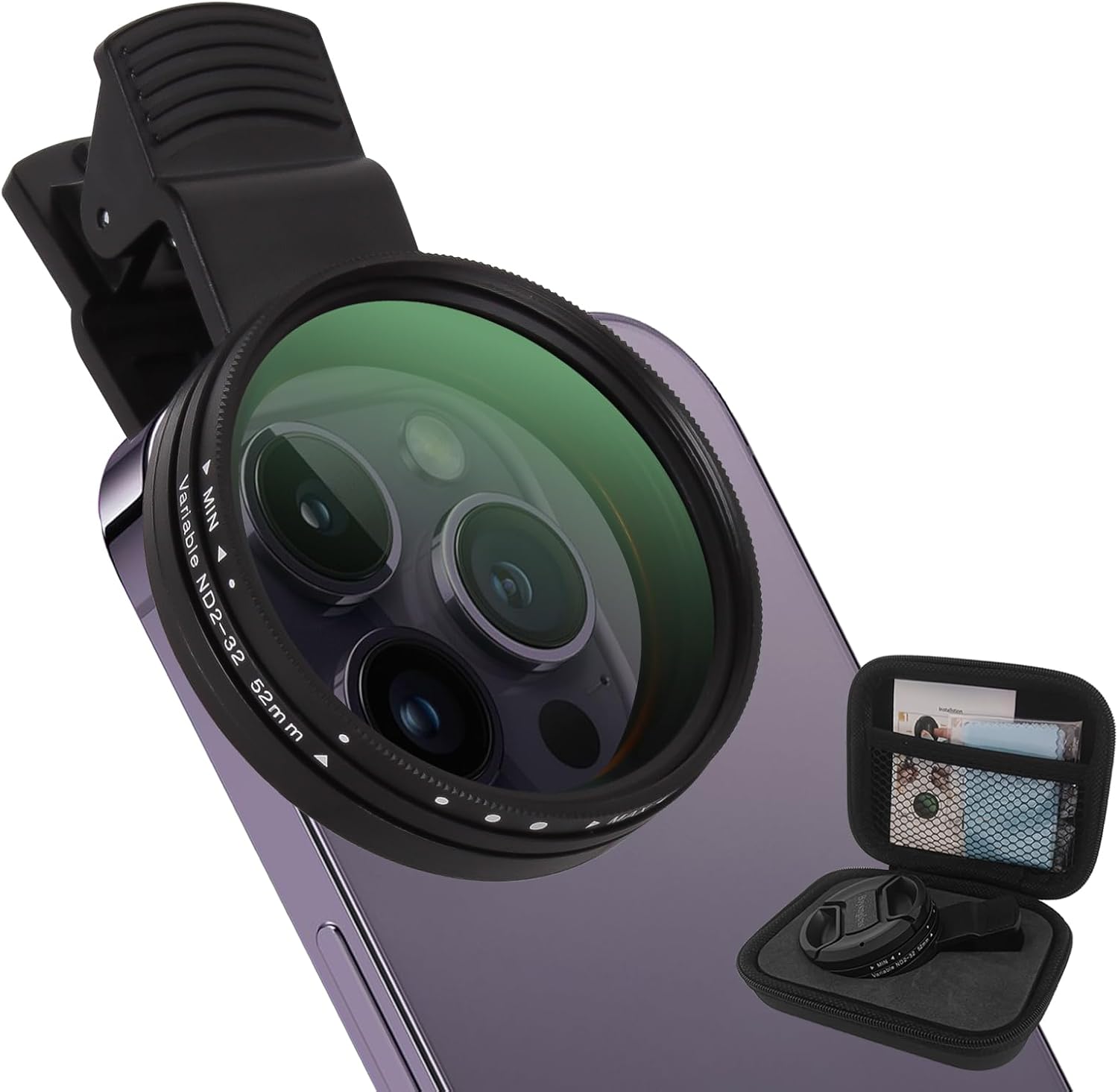 52MM Clip-on Variable ND2-32(1-5 Stops) Phone Lens Filter Kit, Ultra Slim Multi-Coated Adjustable Neutral Density Filter, Compatible for iPhone 16 15 14 13, Google Pixel and Other Smart Phones