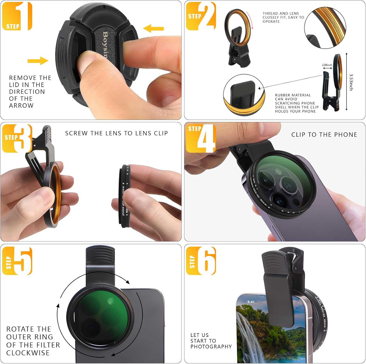 - Easy to Carry: includes ND filter×1, thread universal clip×1, lens cap×1, cleaning cloth×1, user manual×1 , in Boysinglens storage box, which are very helpful for protecting the filter and extending its service life