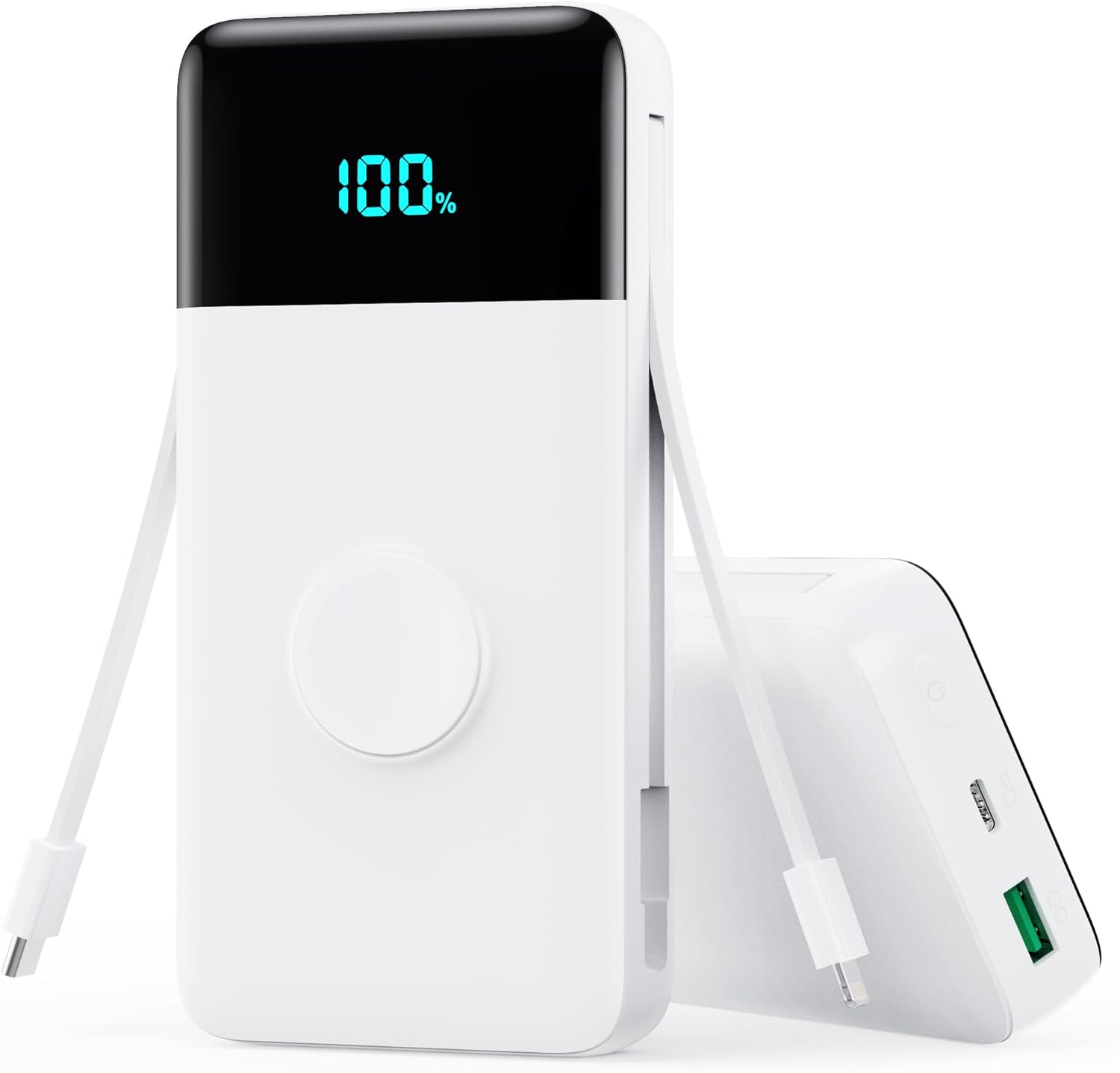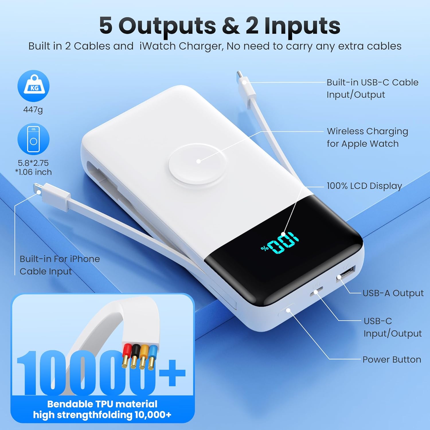 - ă5-in-1 Portable chargerăWith a total of 5 output ports (2 built-in cables, 1 iWatch Charger, 1 USB-A, and 1 USB-C), this power bank can charge up to 5 devices simultaneously and recharge itself with 2 options(USB C cable,USB C port),which is great for multi electronics users who has iPhone, android or Apple Watch and other usb devices.