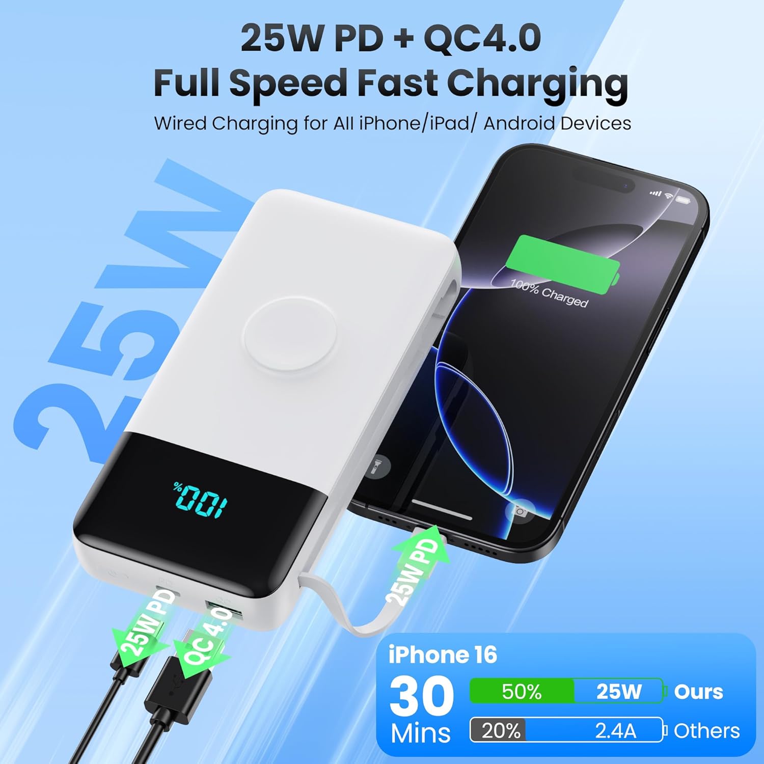 Portable Charger 40800mAh for iPhone with 2 Built-in Cable and iWatch Charger, 5-in-1 25W PD Fast Charging USB C Power Bank,QC4.0 LED Display Battery Pack for iPhone 16/15/14/13/12,Android,Apple Watch