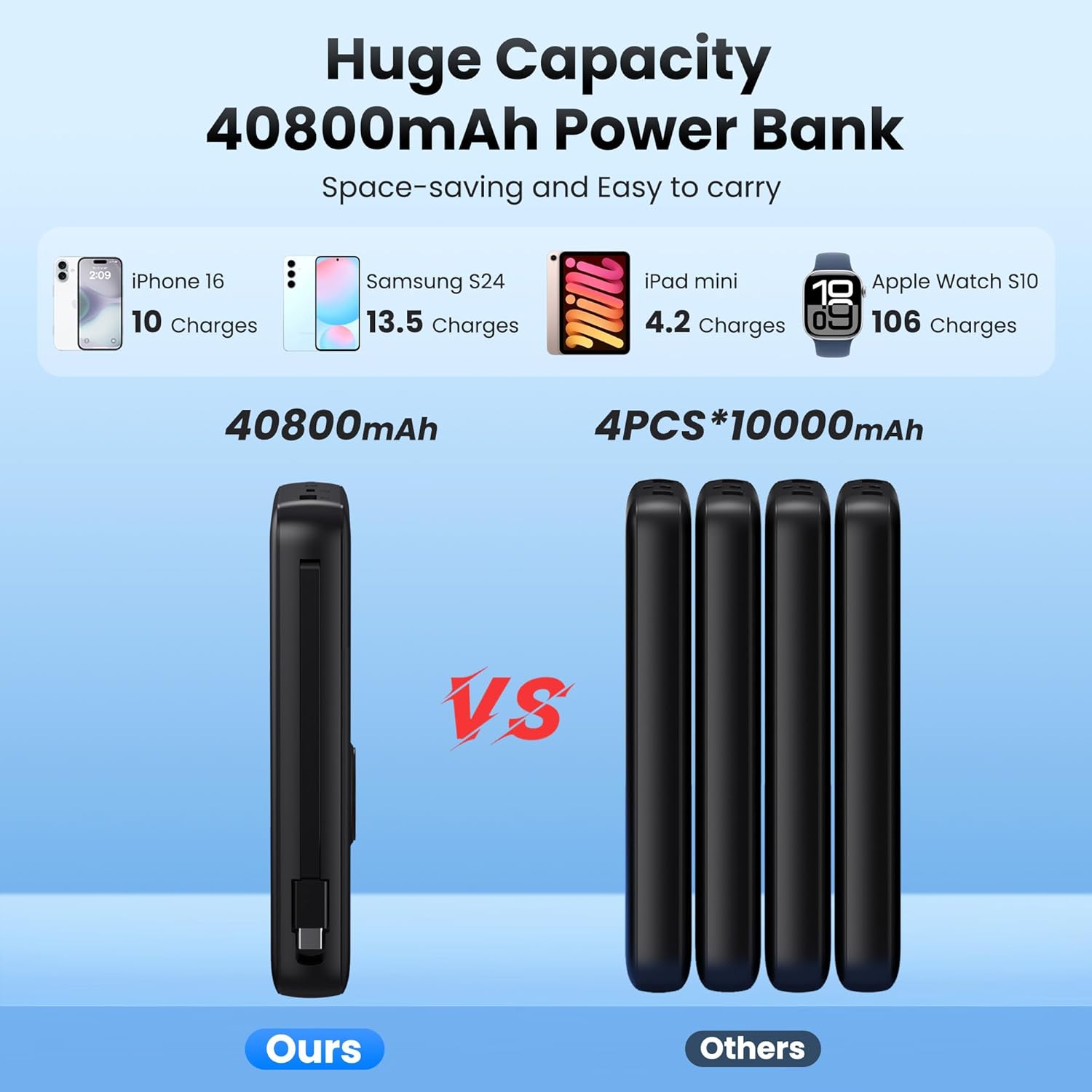 - ăPortable Power Bank with Built-In Cables& iWatch chargerăThis 40800mAh power bank with built in 2 cables (Type-C, ios,) and magnetic wireless charger for iWatch, Widely compatible with iPhone 16/15/14/13/12/ 11/XS /XR/ SE Pro /Pro Max, Samsung S24/S23 Series,Google Pixel,LG, Moto,tablets,Android devices,Apple Watch Ultra 2/Ultra/10/9/8/7/6/SE/5/4/3/2, AirPods and more.