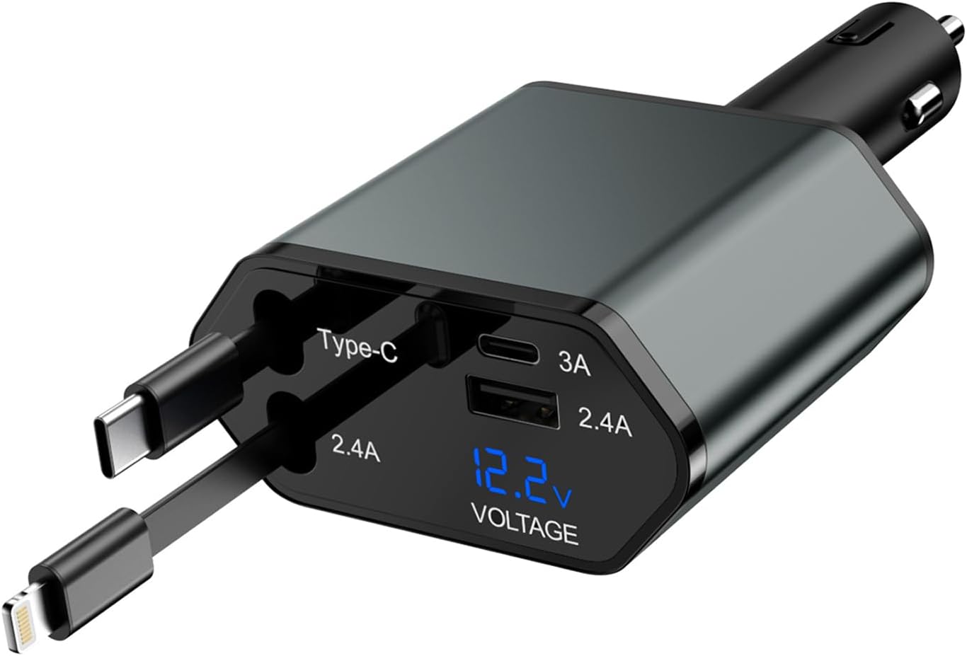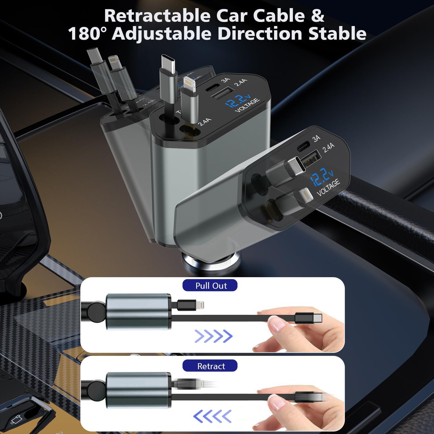 - 【4 in 1 Car Phone Charger Adapter】4 in 1 Retractable car charger charge all four of your devices simultaneously.Retractable car charging, the cable can be pulled out of the range of 80cm (2.6ft) to use, automatically shrink after pulling, stored safely and neatly, will not wrap any cable.