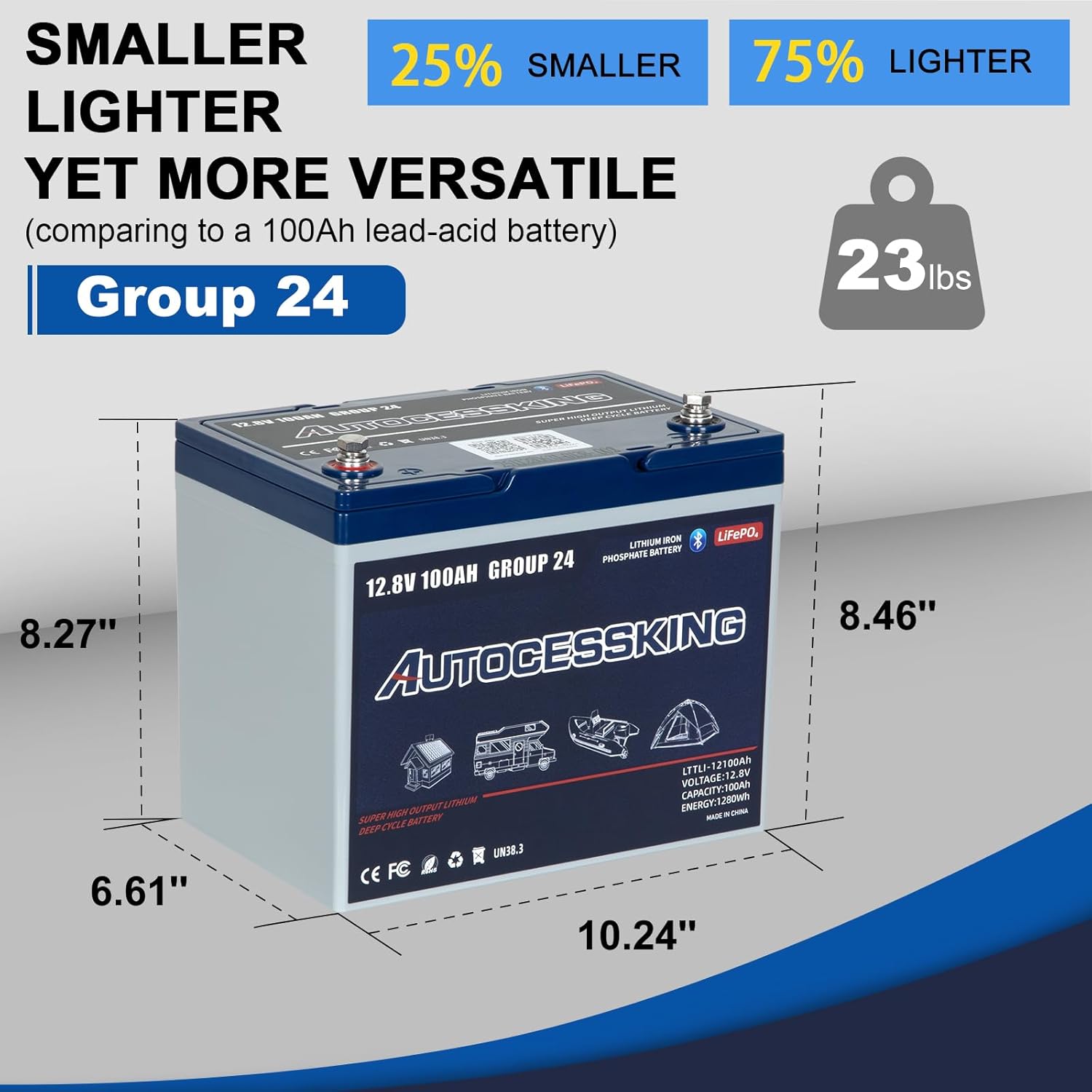- β LIGHTWEIGHT AND VERSATILE - Item Dimensions: 10.24"L x 6.62"W x 8.47"H. weight: 23.5lbs. Our 12v battery engineered with Lithium Iron Phosphate (LiFePO4) technology, all housed in a compact Group 24 size, offering 1/3 the weight, 2x power and 8x longer lifespan compare to a lead acid battery. It is a perfect upgrade for any 12V Deep Cycle battery. It offers 1.28kWh of energy and supports a maximum load of 1536W with a continuous discharge current of up to 120A (peak 500A for 3 seconds), making it ideal for trolling motors. The built-in Bluetooth functionality brings you enhanced convenience, you can monitor the battery anytime, anywhere.