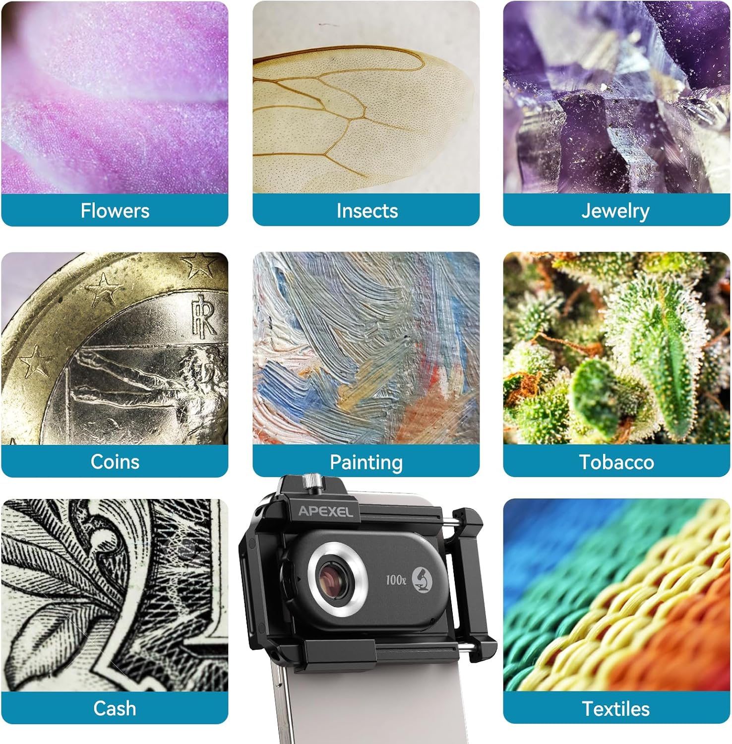- 🔎【Easy Installation, Plug and Play】Installation is a breeze with just 4 simple steps. No need for any APP—just clip it on and start using immediately. Just one smartphone, you can explore the micro world anywhere. APEXEL pocket digital microscope perfect for photography enthusiasts, children, collectors, engineers, or anyone interested in exploring the micro world. Of course, it also makes an excellent gift.