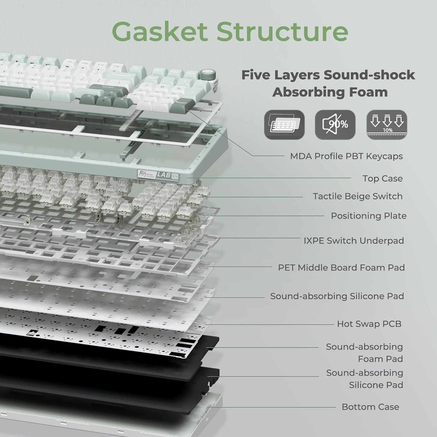 - ăGasket Mount Gaming Keyboard with Number Padă: Computer keyboard adopts 98 keys layout design, retaining numpad, arrow keys and most functions, saving your desktop space and making it more suitable for gaming and work. Five layers sound-absorbing foam to ensure thocky feeling and creamy sounding for you