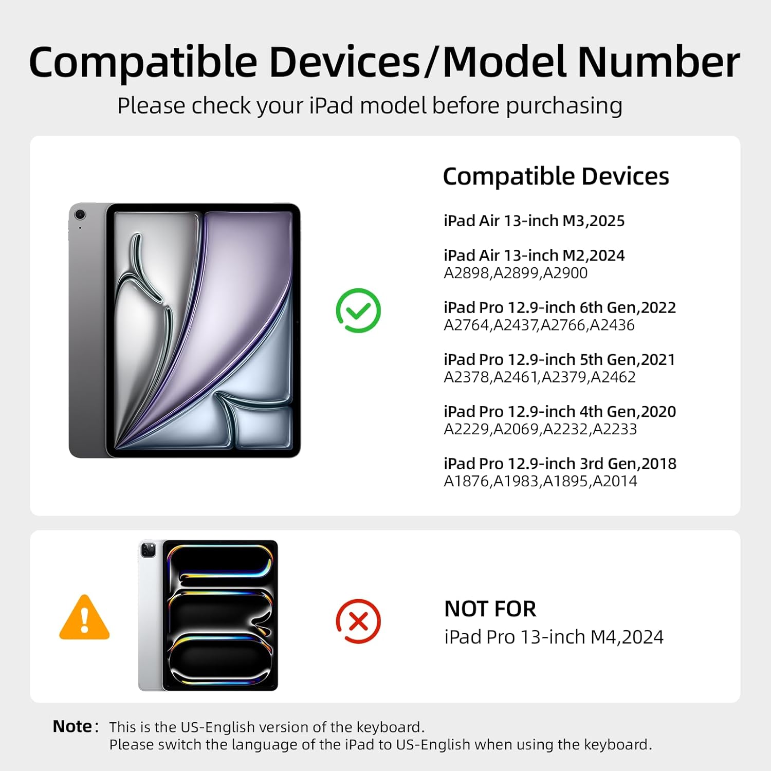 - Compatible Devices : iPad Air 13-inch (M3 2025 & M2 2024) & iPad Pro 12.9-inch(6th-2022,5th-2021,4th-2020,3rd-2018 Gen).NOTE:NOT compatible with iPad Pro 13-inch M4 2024 iPad Air 13-inch (M3 2025 & M2 2024) & iPad Pro 12.9-inch(6th-2022,5th-2021,4th-2020,3rd-2018 Gen).NOTE:NOT compatible with iPad Pro 13-inch M4 2024