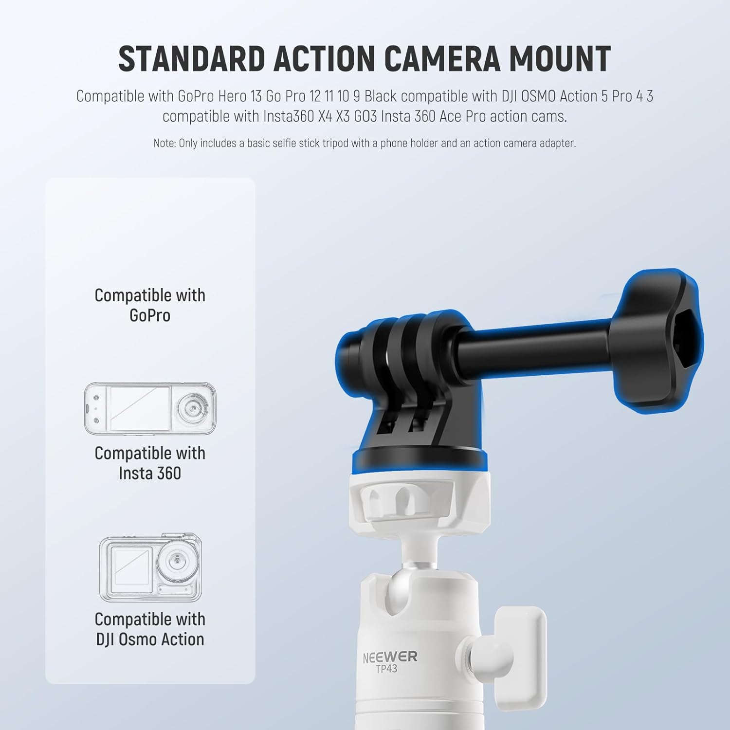 - ăTripod for Phone & Action Cameraă The desktop selfie stick stand adjustable phone holder is compatible with iPhone 16 15 Pro Max Plus i Phone 14 Samsung Galaxy S25 S24 S23 Ultra Google Pixel 9 8 7 Pro Android mobile, with one cold shoe for photography accessories or filming gears like a monitor, fill light, microphone. The mount adapter is compatible with GoPro Hero 13 Go Pro 12 11 10 Black compatible with DJI OSMO Action 5 Pro 4 3 compatible with Insta360 X5 X4 X3 GO 3S Insta 360 Ace Pro etc
