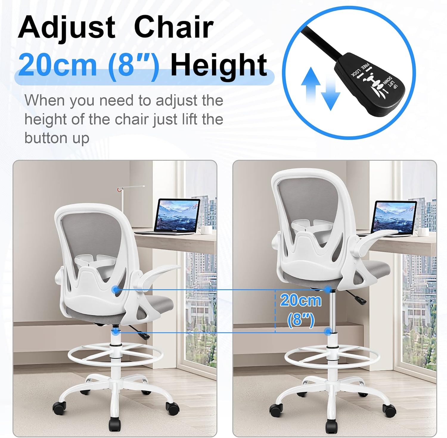 - **Adjustable Comfort:** Our Drafting Chair features a customizable height foot stool and a 90-degree overturned armrest design, making it ideal for standing desks, sitting desks, and bars. Enjoy the flexibility tailored to your workspace needs.