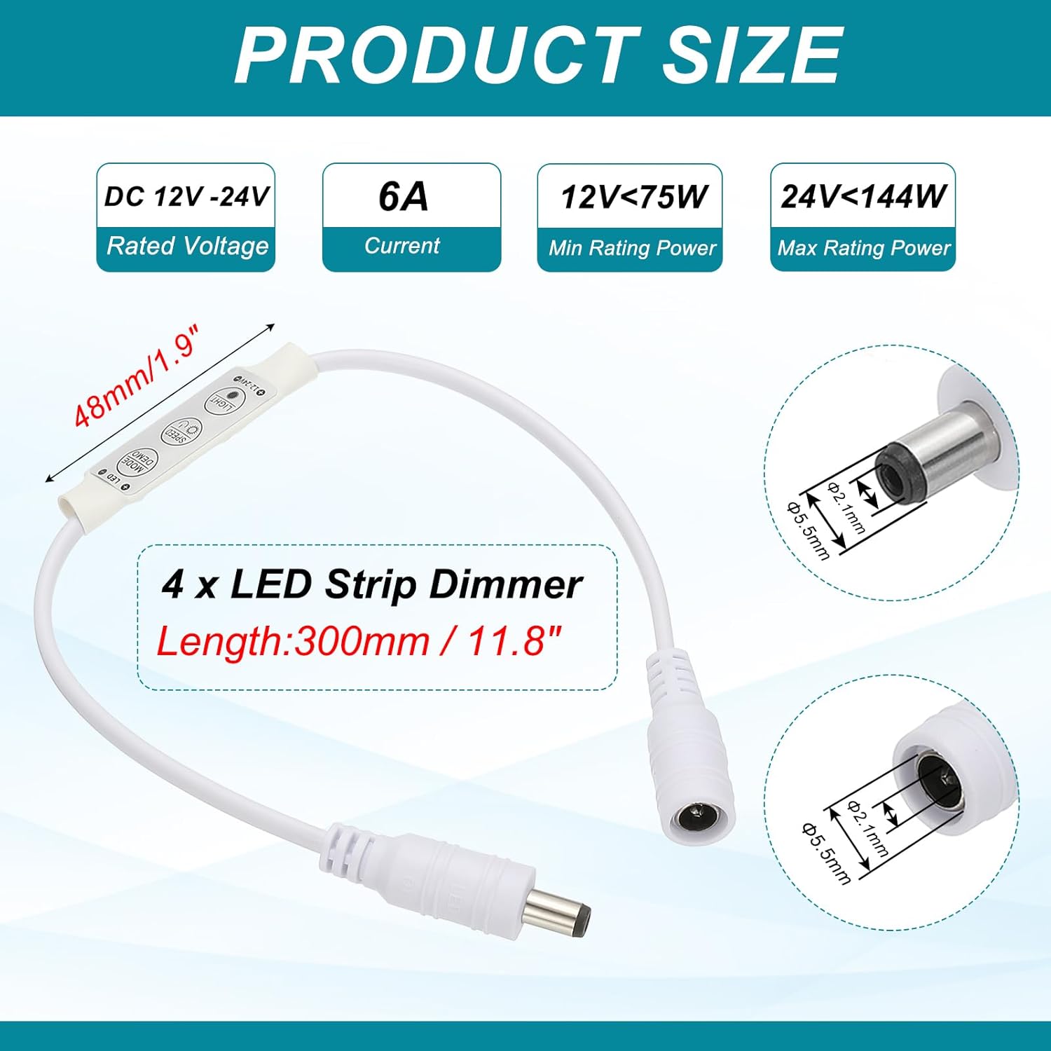 - Color: White; Rating Voltage: DC 12V to 24V; Current: 6A; Rating Power: 12V<75W, 24V<144W; LED Switch Size: 48x13x4mm / 1.9 inch x 0.51 inch x 0.16 inch; Total Length: 300mm / 11.8 Inch; DC Plug Size: 5.5x2.1mm / 0.22 x0.08 inch; Package Content: 4 x LED Strip Dimmer
