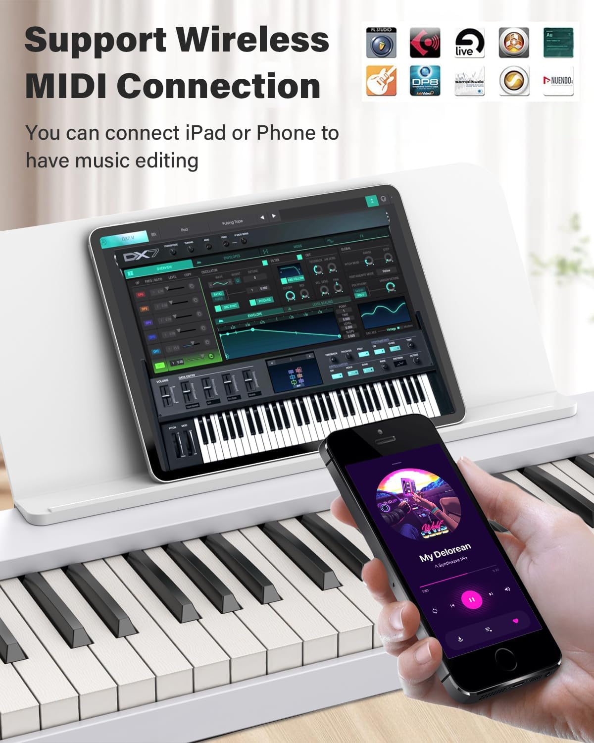 - 88 Semi-Weighted Keys: This portable digital piano keyboard is an excellent entry-level instrument for beginners; It features a full 88-key layout and semi-weighted keys that provide a balance between synth-action and fully weighted piano keys, providing great finger touch and key depth, and giving you the complete range required for any piece