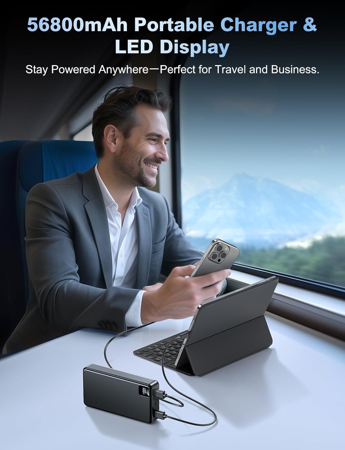 - Massive 56800mAh Capacity – Power That Goes the Distance: Designed for power-hungry users, this 56800mAh portable charger delivers days of reliable energy for iPhone 16/15/14/13 Pro Max/Pro/Plus or Sumsang, Google Pixel. Charge your phone up to 11 times or your tablet multiple times—ideal for long trips, camping, or business travel. Say goodbye to low battery anxiety and enjoy the freedom of staying connected, wherever your journey takes you.