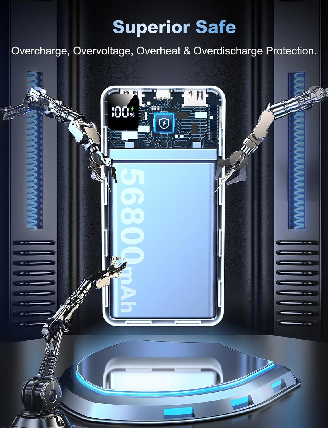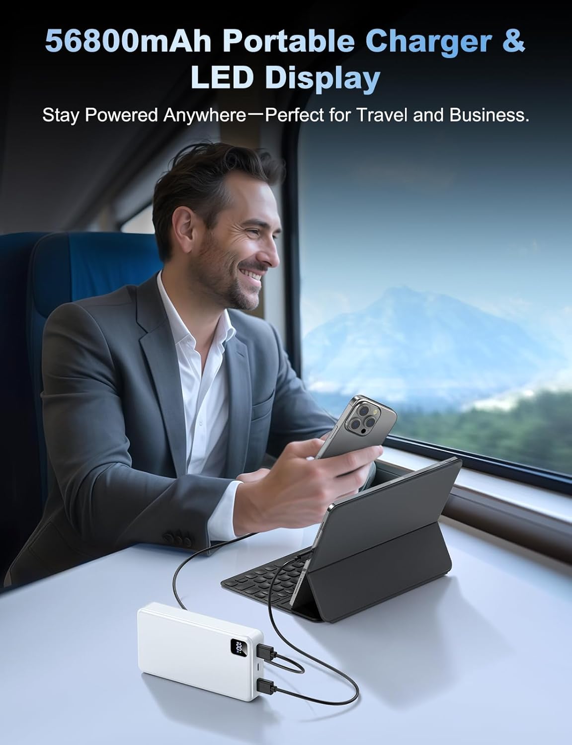 - Massive 56800mAh Capacity – Power That Goes the Distance: Designed for power-hungry users, this 56800mAh portable charger delivers days of reliable energy for iPhone 16/15/14/13 Pro Max/Pro/Plus or Sumsang, Google Pixel. Charge your phone up to 11 times or your tablet multiple times—ideal for long trips, camping, or business travel. Say goodbye to low battery anxiety and enjoy the freedom of staying connected, wherever your journey takes you.
