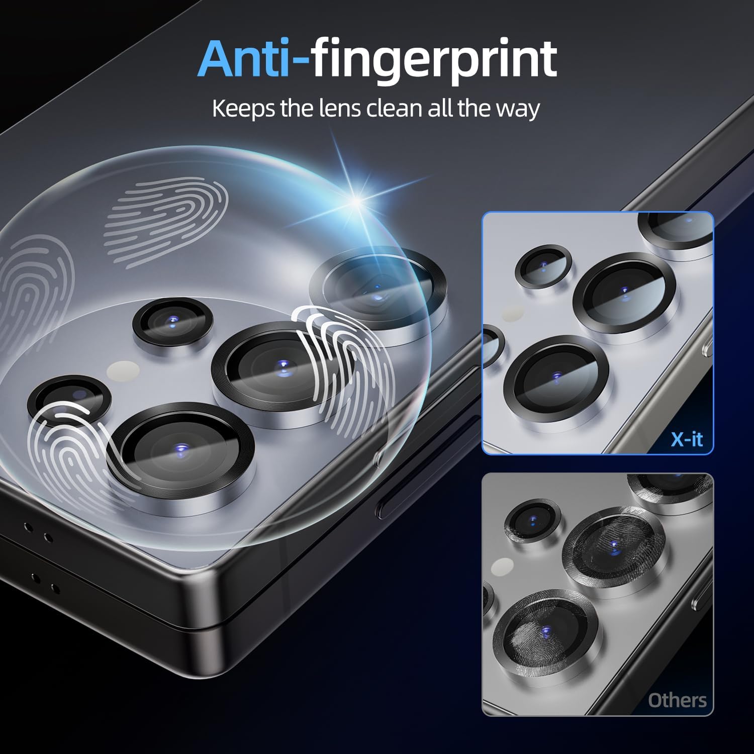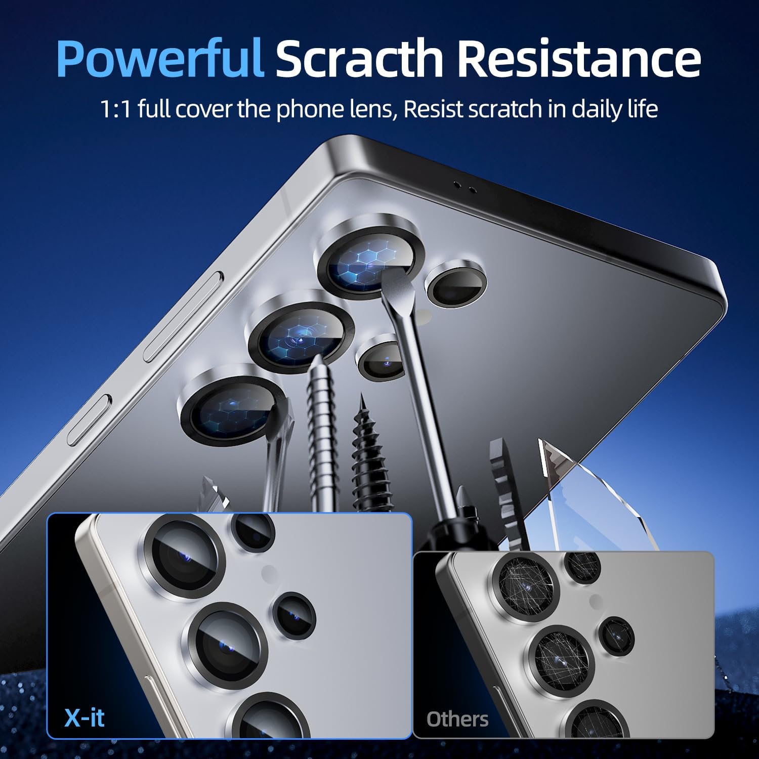 - [Military-grade protection, drop-proof and scratch-proof] X-it Samsung S25Ultra lens protective film, high-density aluminum alloy frame + 12KG solid pressing edge process, using aluminum alloy materials commonly used in the aerospace field, bending strength increased by 50%, hardness up to 9H, scratch-resistant and wear-resistant, the lens is not afraid of sand and stone friction. Super hydrophobic coating, oil stains can be wiped clean, rainy and snowy weather does not affect imaging.