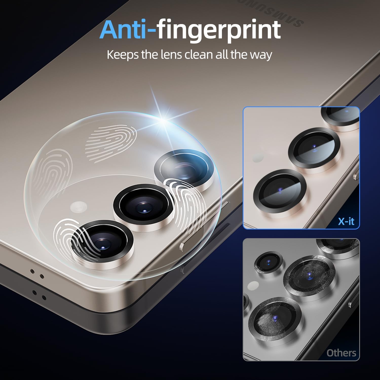 - [Military protection, anti-drop and anti-scratch] X-it Samsung S25 Plus lens protective film, high-density aluminum alloy frame + 12KG solid pressing edge process, using aluminum alloy materials commonly used in the aerospace field, bending strength increased by 50%, hardness up to 9H, scratch-resistant and wear-resistant, the lens is not afraid of sand and stone friction. Super hydrophobic coating, oil stains can be wiped clean, rain and snow weather does not affect imaging.