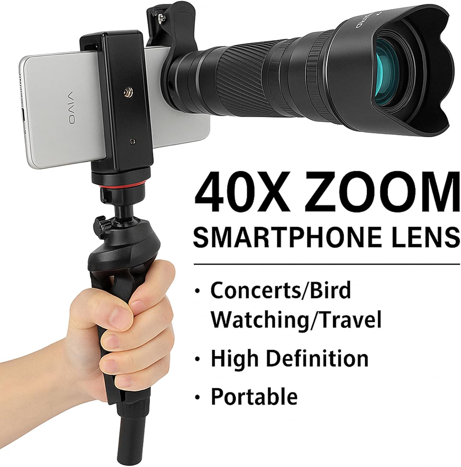 - 🔭40X High-Power Zoom Lens: Upgrade your smartphone camera with a powerful 40X telephoto lens. Easily capture distant subjects like wildlife, the moon, and landscapes in high detail — no tripod needed.