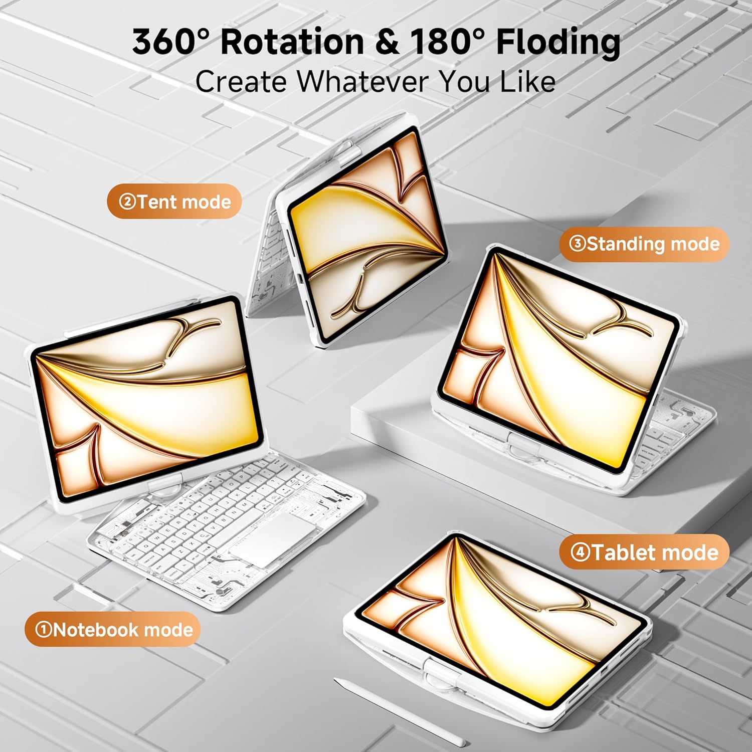 Keyboard Case for iPad 11 inch Pro 4/3/2/1st Gen & 11’’ iPad Air 2025 M3, 2024 M2 & 10.9" iPad Air 5th/4th Gen, 360° Rotating Stand Transparent Protective Cover with Pencil Holder (White)