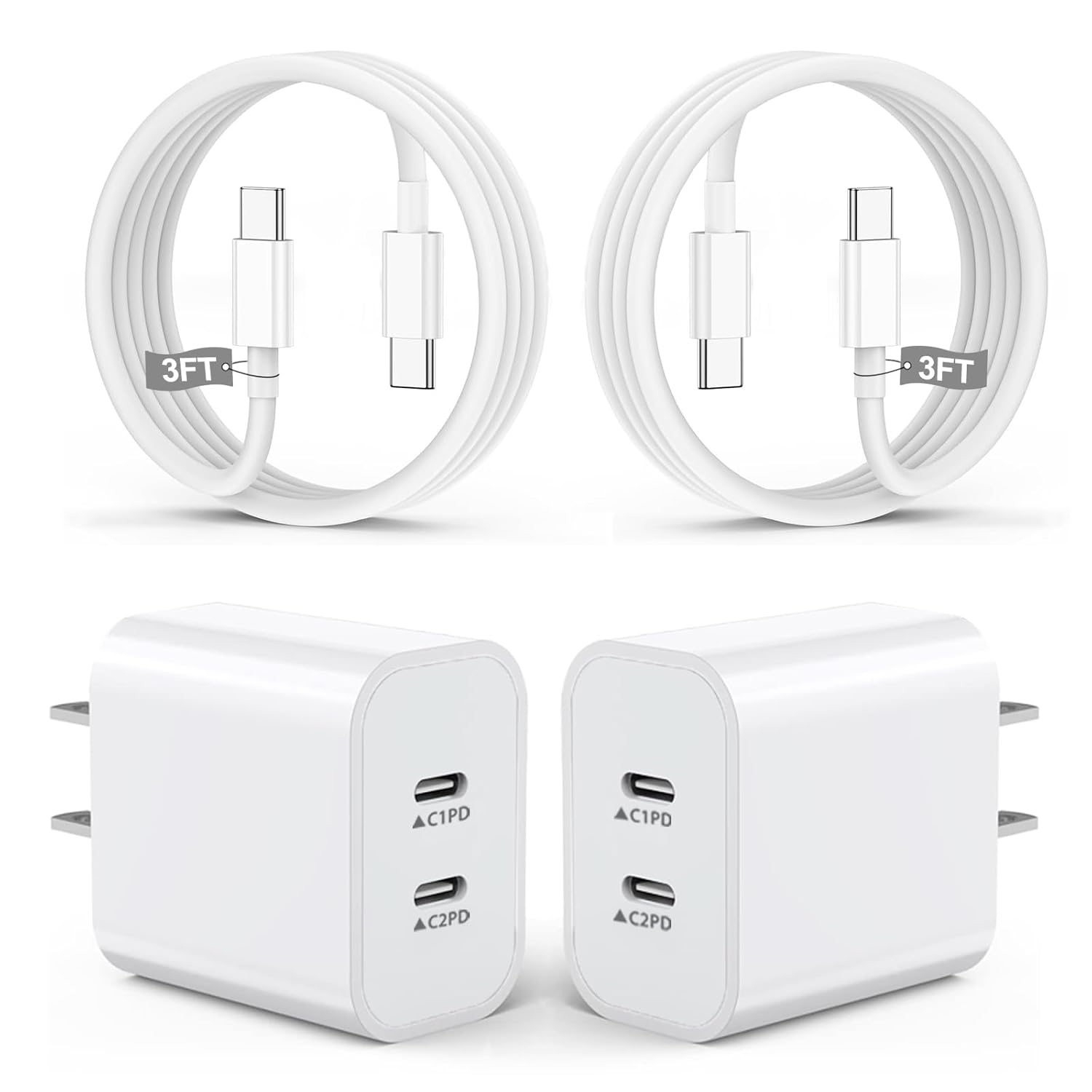 - [What You Get]2Pack Dual Port USB-C Charger Blocks and 2Pack 3ft USB C to USB C Charging Cables.