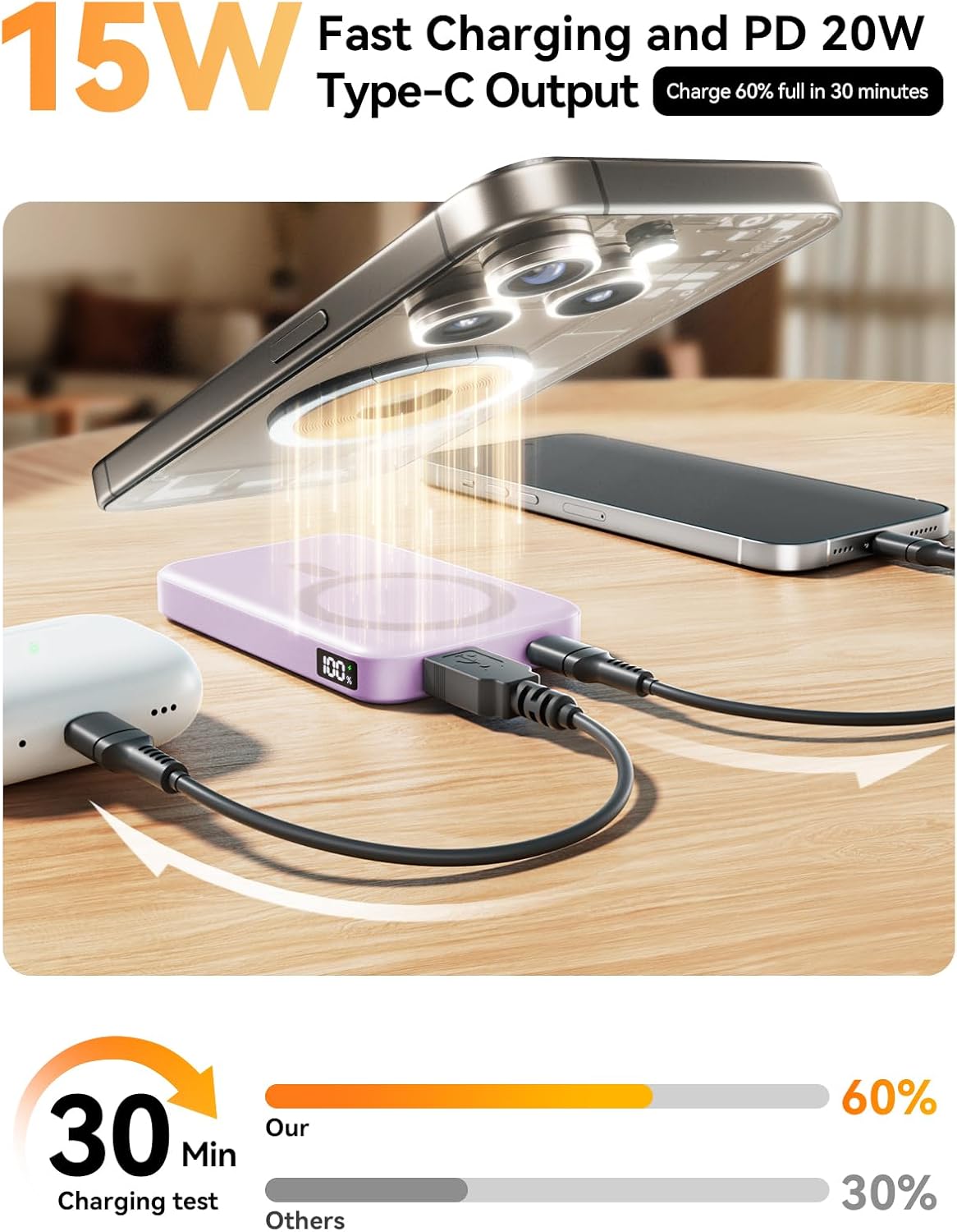- Reliable Safety, Perfect for Travel: Designed with your safety in mind, this MagSafe battery pack features multiple protection systems, including overcharge, overcurrent, and short-circuit safeguards. Its intelligent power management ensures safe charging every time. Compact and airline-approved, it’s ideal for travel, business trips, and everyday use—keeping your devices powered and protected wherever you go.