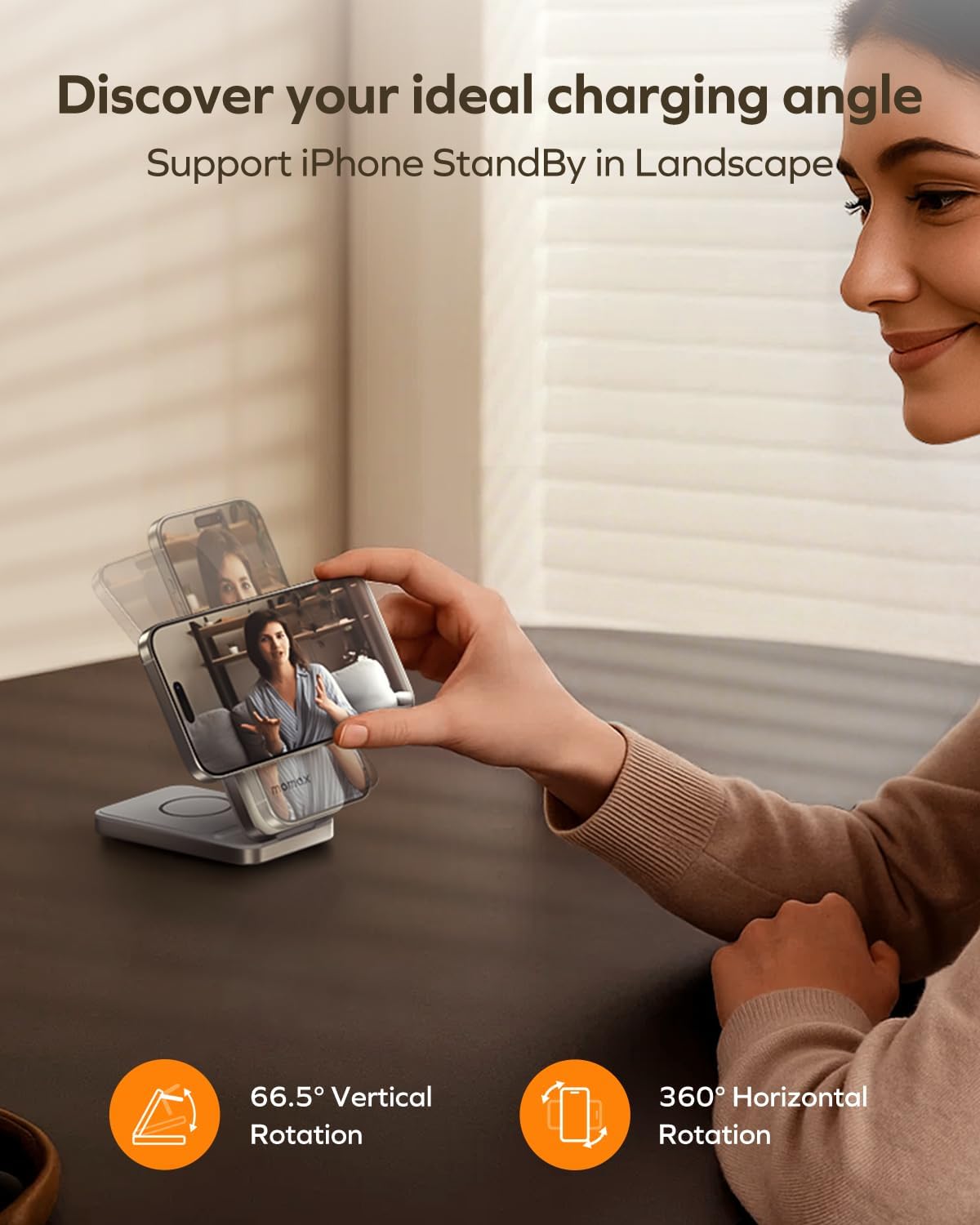 - POCKET-READY, TRAVEL ON THE GO - Crafted from Al-alloy shell, smooth & premium touch feeling. Customize your view with 0–66.5° tilt flexibility. Activate iOS 17 StandBy in landscape. At only 7.3 oz, this wireless charging station boasts a size comparable to a deck of cards when folded and weighs less than a baseball. Not only for deskwork charger stand, but also for business trips
