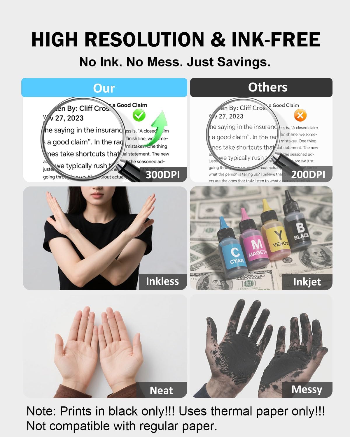 - ✅ Inkless Portable Printer – No Ink, No Mess! Say goodbye to cartridges and toner! The iDPRT 610Pro portable printer uses advanced thermal technology for clean, cost-effective, 300DPI printing—anytime, anywhere. Includes: printer, 10 sheets thermal paper, USB-C cable & free app.(⚠️ Only compatible with black & white thermal paper. Not for inkjet/laser paper).
