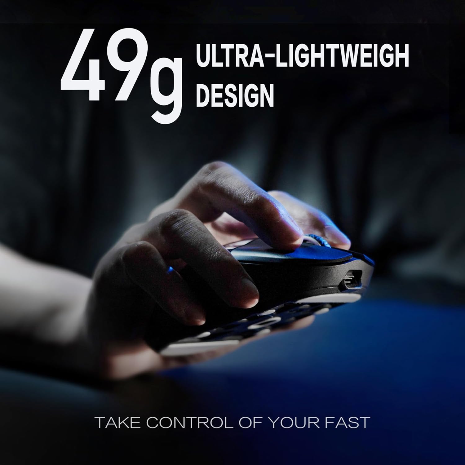 - 49G Ultra-lightweight Design: Our gaming mouse wireless features an lightweight yet sturdy design weighing just 49g, with a hollowed-out bottom and precision cutting in the feet pads, allowing gamers to smooth fast, precise movements while reducing gaming fatigue