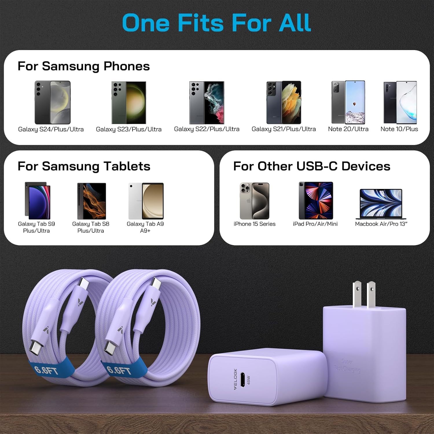 45W Super Fast Charger USB C,45 Watt Type-C Android Phone Charger Fast Charging Block with 6.6FT Type C Cords for Samsung Galaxy S25 Ultra/S24 Ultra/S24+/S23 Ultra/S22 Plus/S20,Tab S9/S8 Ultra(Purple)