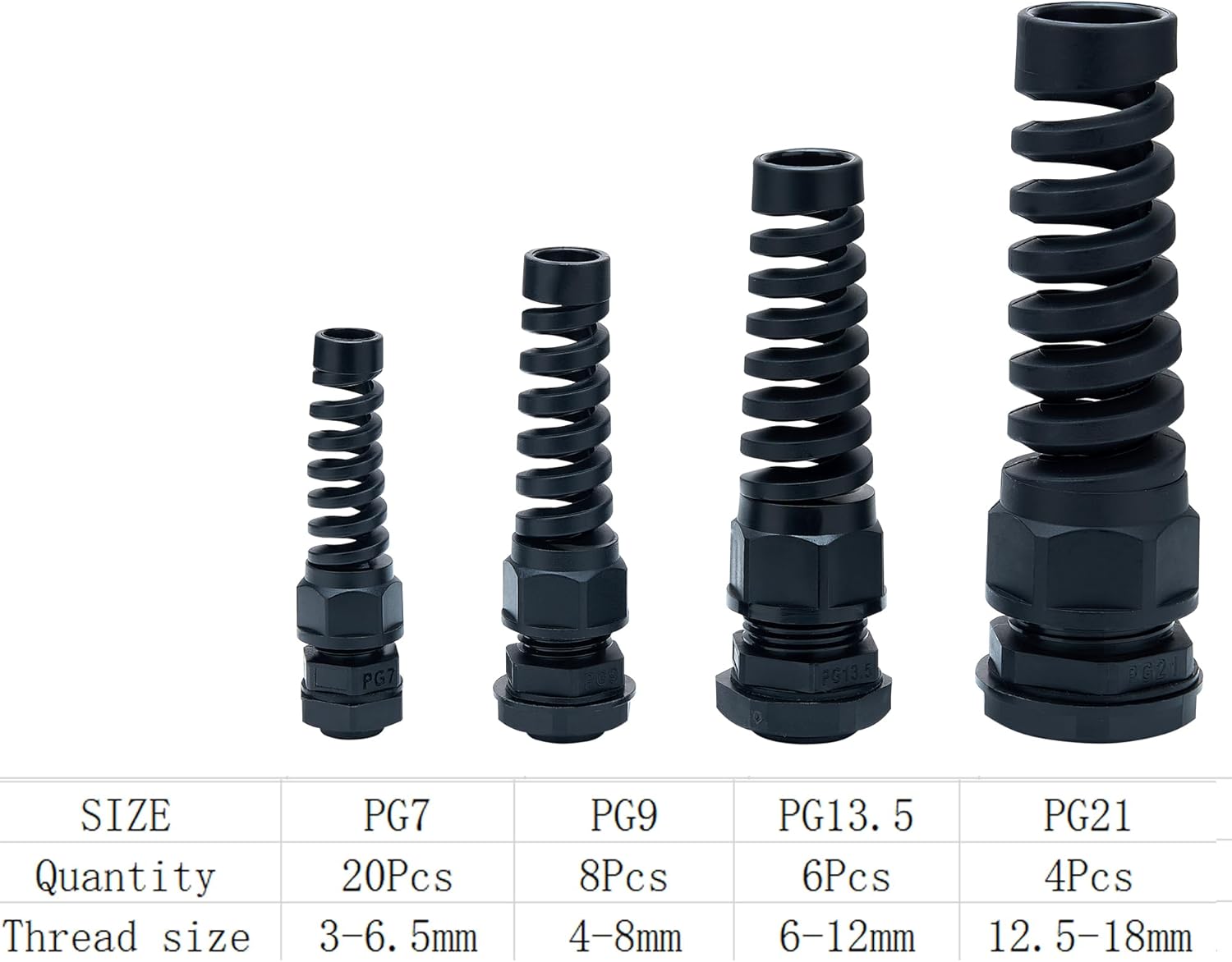 - 【Diverse PG - type Waterproof Cable Glands】: Our kit includes PG7(20Pcs), PG9(8Pcs), PG13.5(6Pcs), and PG21(4Pcs) cable glands, meeting different cable size requirements. Each gland is made from Nylon PA66 plastic for durability and reliable waterproof performance.