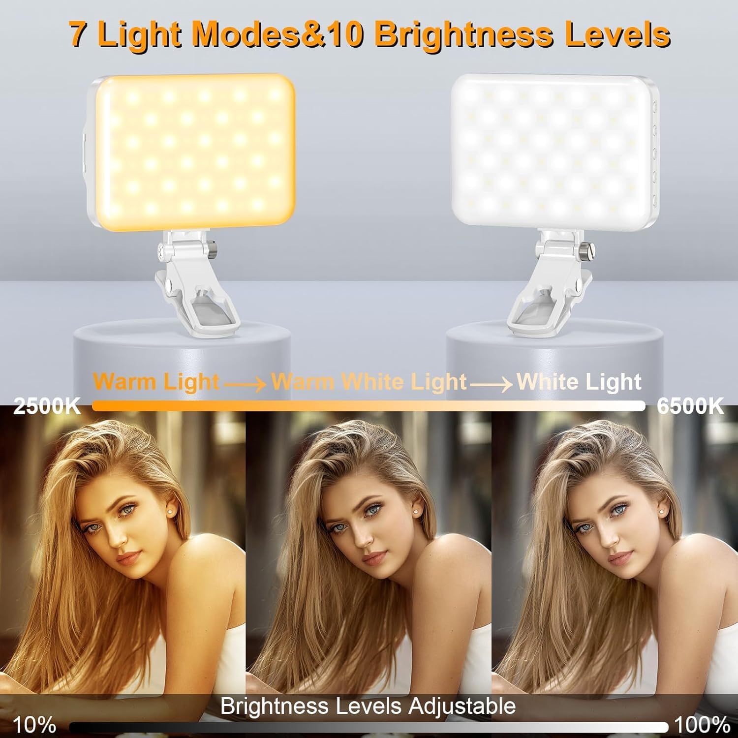 Selfie Light, LED Camera Light Video Lights 60 LED 2200mAh Rechargeable Phone Light 7 Modes, 10-Level Brightness, Portable Clip on Light for Phone/Tablet/Laptop White