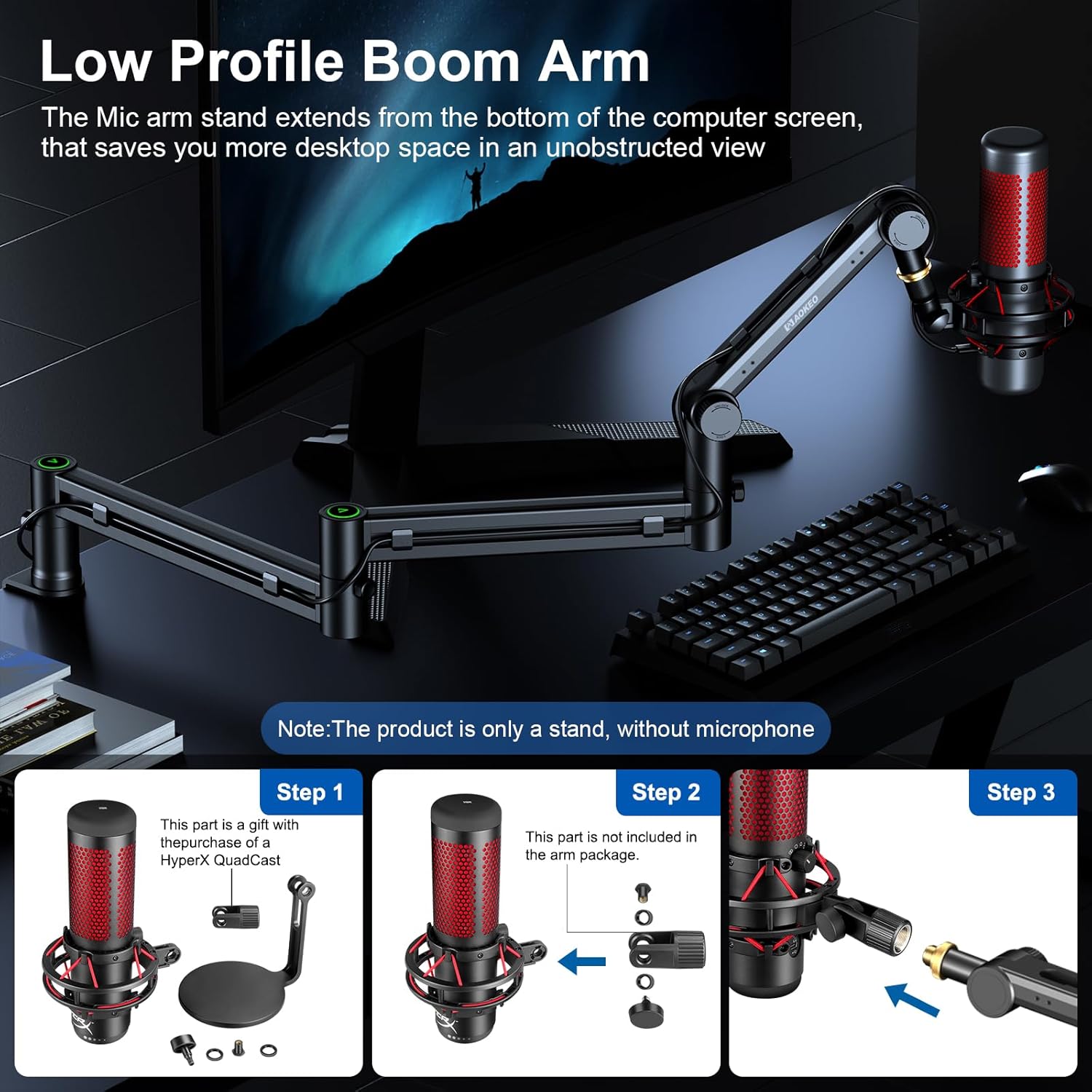 - QUALITY ASSURANCE:This low profile mic arm is made of high-quality steel forging, sturdy and durable, and not easy to be deformed or damaged even after long-term use. This product provides one year after-sales service, please feel free to contact us if you have any questions. (Microphone is not included in the package)