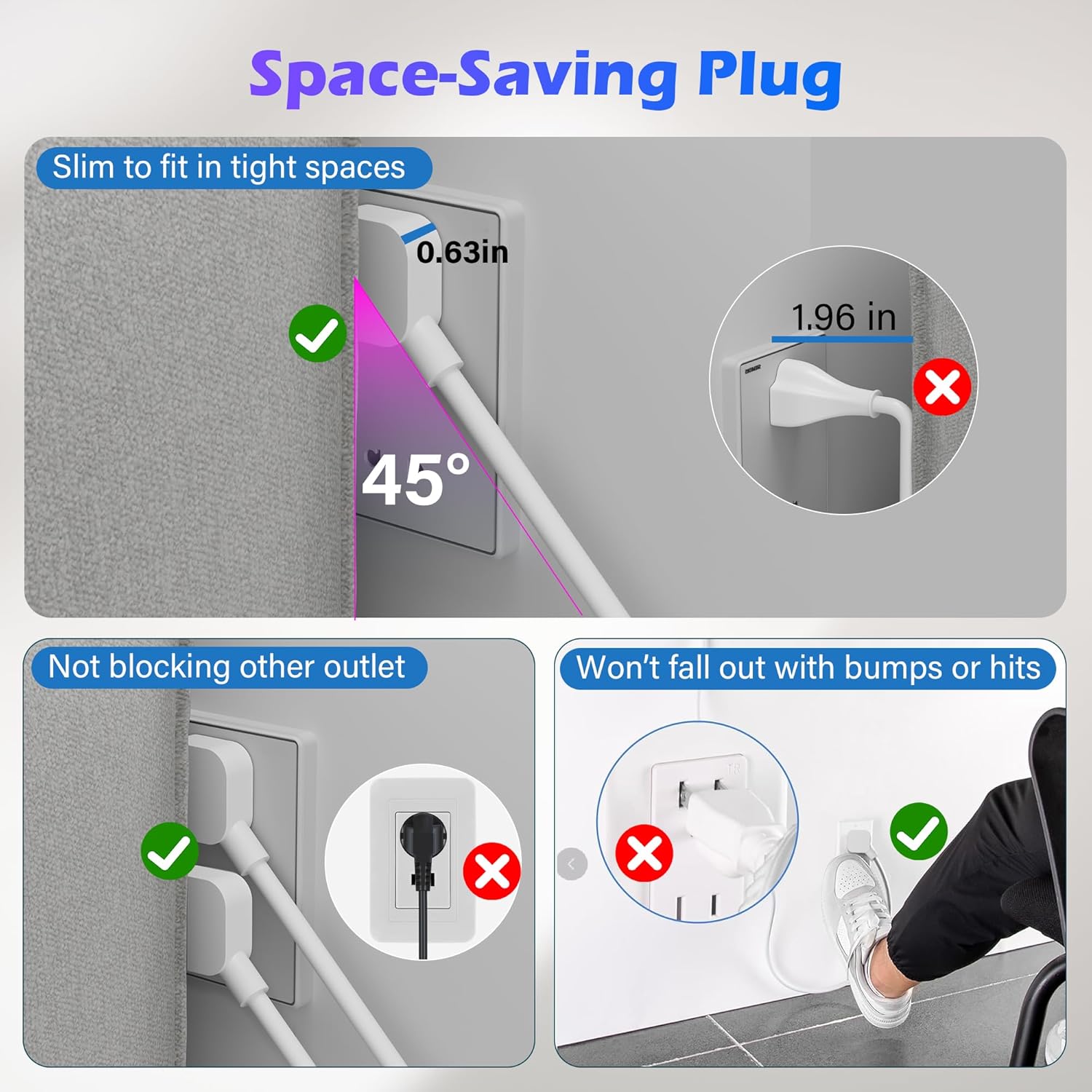 - Our Advantages: SVT power equipment replacement cord, made of high-quality PVC that is flexible, soft, and smooth touch----One-piece molded plugs resist breaking, with smooth, burr-free edges and feature a sleek, modern, and durable design----Some models feature a flat male plug, perfect for tight spaces like behind sofas or monitors----Some variants offer a 90-degree L-shaped receptacle to save space, reduce protrusion, and protect the cable from bending, keeping it neat----Withstands over 10,000 bends for extended service life----Secure connection with smooth plug-in/unplug operation----Stylish white cable blends well into home or office environments----15 cable ties for tidy organization