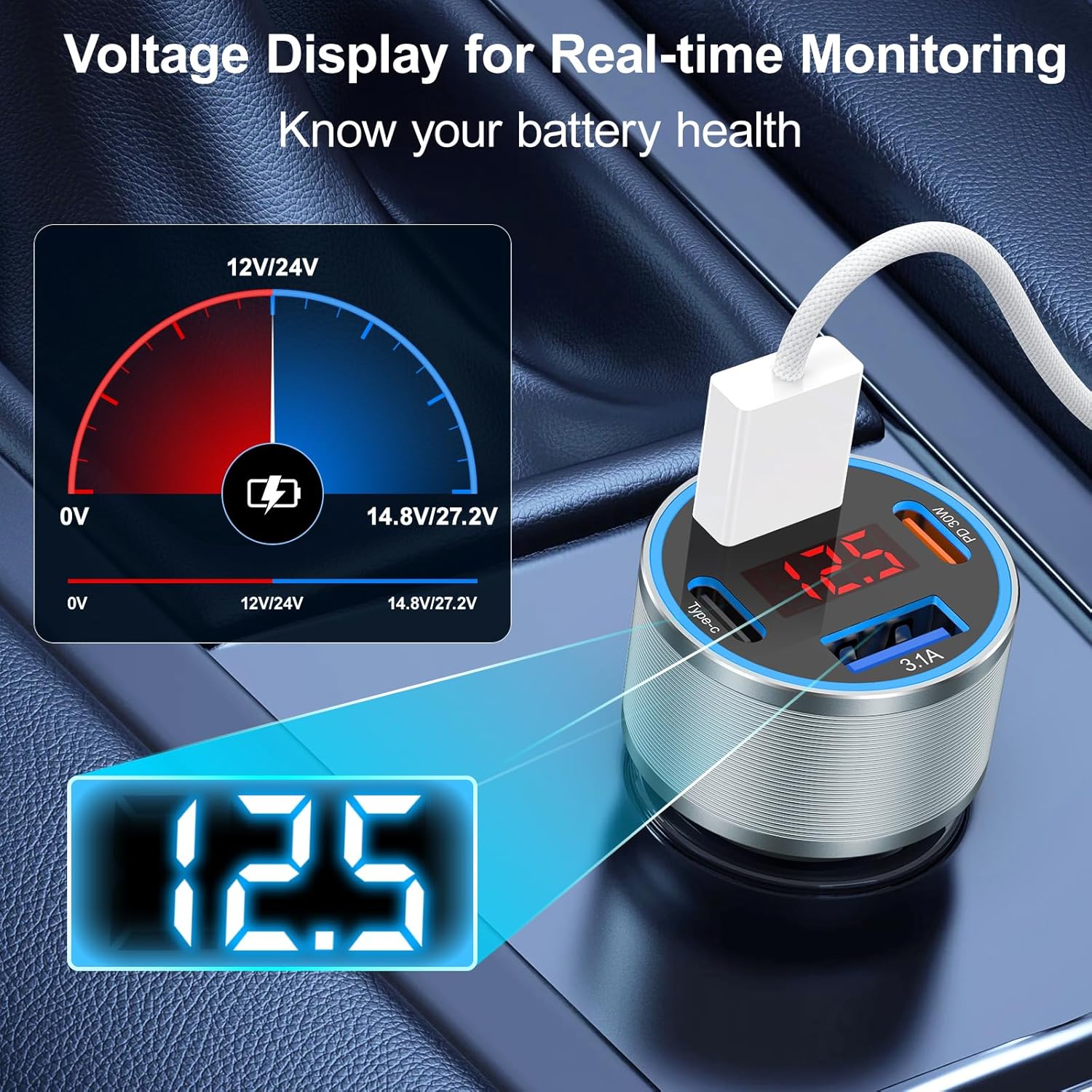 - ăType C Car Charger with Voltage DisplayăThis usb c car charger fast charging comes with LED digital voltmeter, which can monitor and display the voltage of the vehicle battery in real time,so as to master the health of the vehicle's electrical system. In addition, the car charger designed with led atmosphere light, it lets you know if the cigarette lighter USB charger is successfully connected to the power source and lets you find the charging port quickly in darkness.