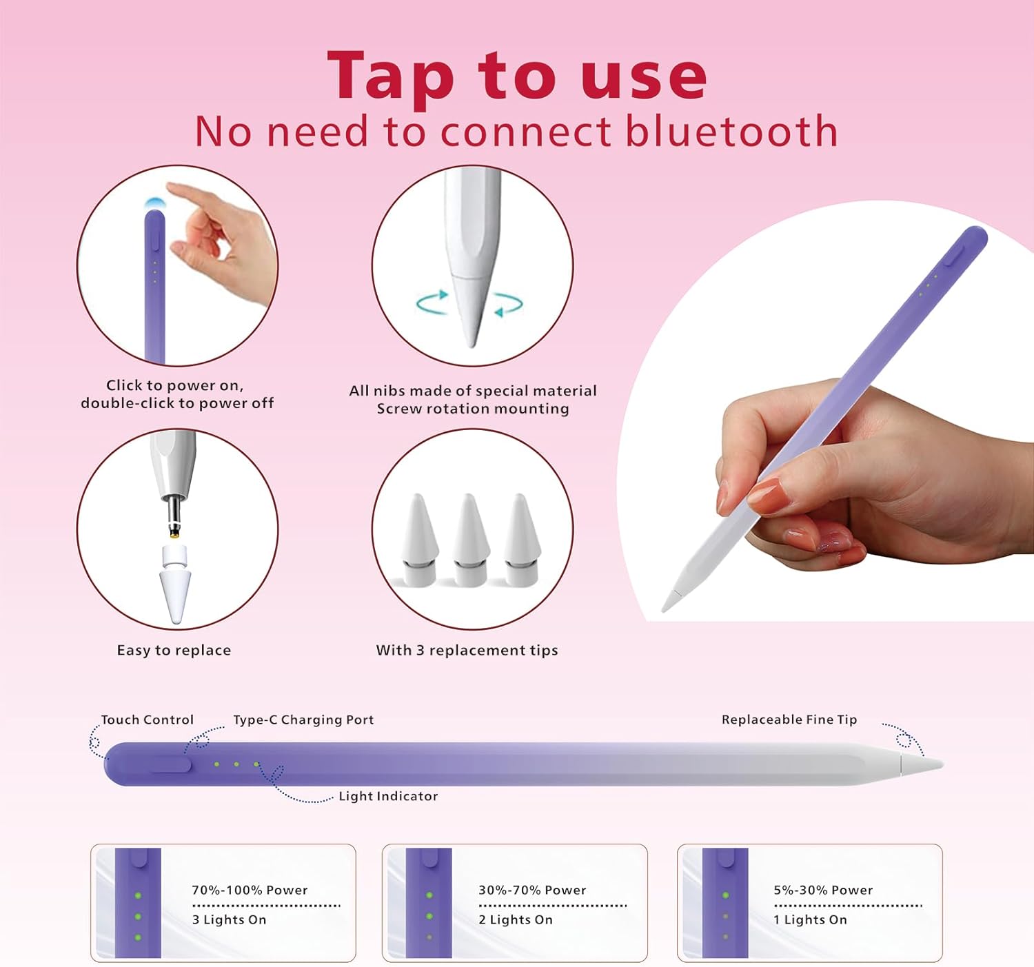 - 【Perfectly Precision & Intelligent Power Management】The iPad pen is equipped with a 0.9mm upgraded POM tip, which makes it more sensitive and precise.No lagging, no skips, no scratches, giving you a better experience like a real apple pencil. The iPad pen will automatically power off after 2 hour to remind users to take a rest to relieve eye fatigue, while protecting the battery life.And there is no use of the automatic shutdown function within 5Mins, saving power.