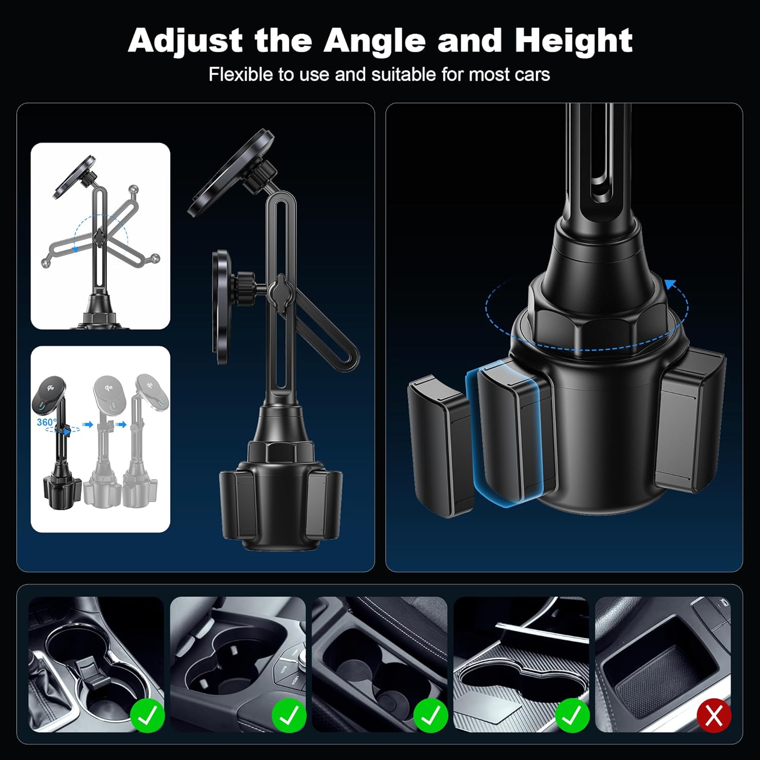 - 【Adjustable Viewing Angle and Height】The Qi2 Wireless Charger Car Cup Phone Holder apply aluminum alloy material into Gooseneck forging,make it solidest and durable.Between the Up to 8 inch long neck, makes it easier and flexible to operate and access your mobile phone. You can adjust the height as you like, achieve maximum flexibility. The ball head can rotate 360°, which can help you get the most comfortable and safest viewing without adjust neck