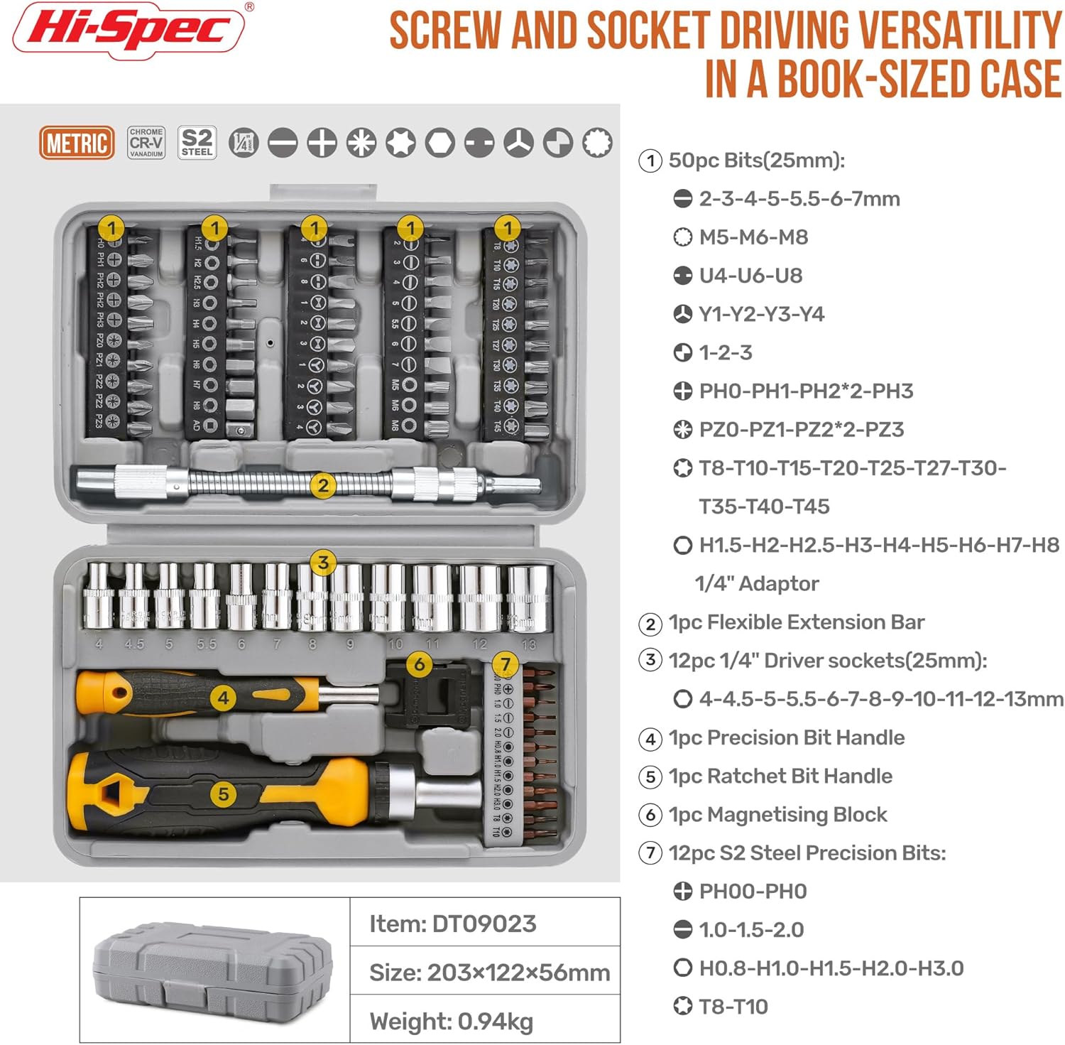 Hi-Spec 78pc Multi Screw Driver Bit Set and 1/4 inch Socket Set with Handles. Flexible Extension, Precision, Torx and Tamperproof 1/4 inch Hex Screwdriving Bit Accessories in a Case