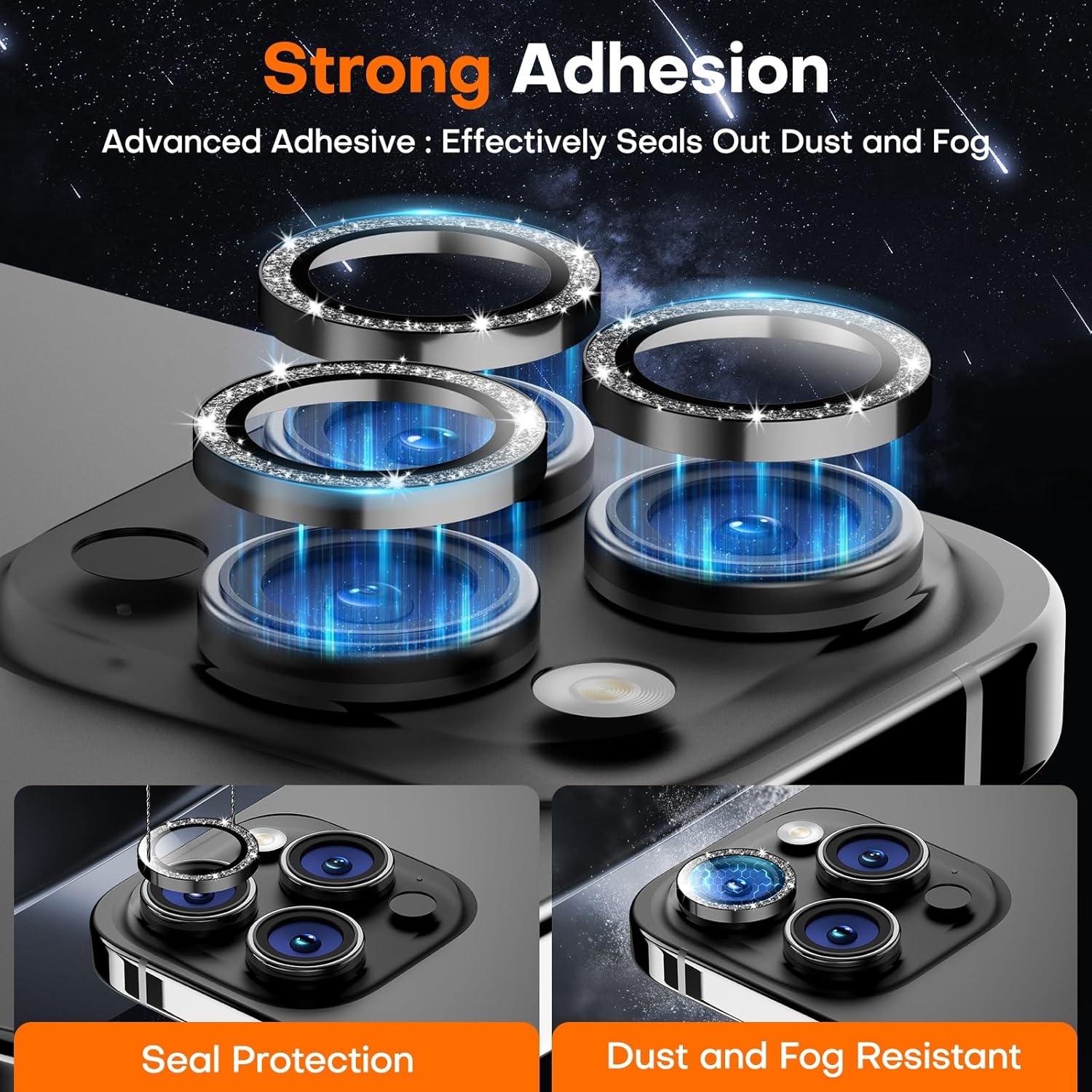 Camera Lens Protector for iPhone 16 Pro Max/16 Pro/15 Pro Max/15 Pro/14 Pro Max/14 Pro, Sapphire Glass Metal Individual Camera Cover Screen, Anti-drop, Case Friendly- Glitter Black Titanium