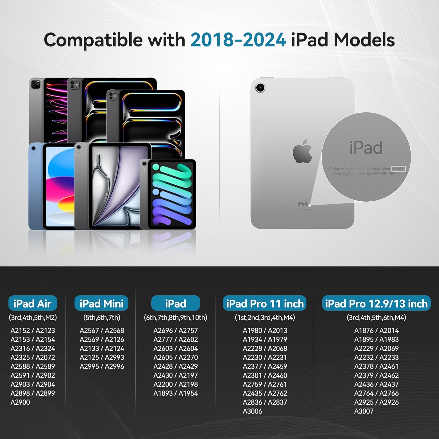 - Compatible Devices : iPad 6th/7th/8th/9th/10th 2022 Gen, iPad Air 3rd/4th/5th 2022 Gen, iPad Pro 11-inch 1st/2nd/3rd/4th/5th 2024 Gen, iPad Pro 12.9-inch 3rd/4th/5th/6th/7th 2024 Gen, iPad mini 5th/6th 2021 Gen iPad 6th/7th/8th/9th/10th 2022 Gen, iPad Air 3rd/4th/5th 2022 Gen, iPad Pro 11-inch 1st/2nd/3rd/4th/5th 2024 Gen, iPad Pro 12.9-inch 3rd/4th/5th/6th/7th 2024 Gen, iPad mini 5th/6th 2021 Gen