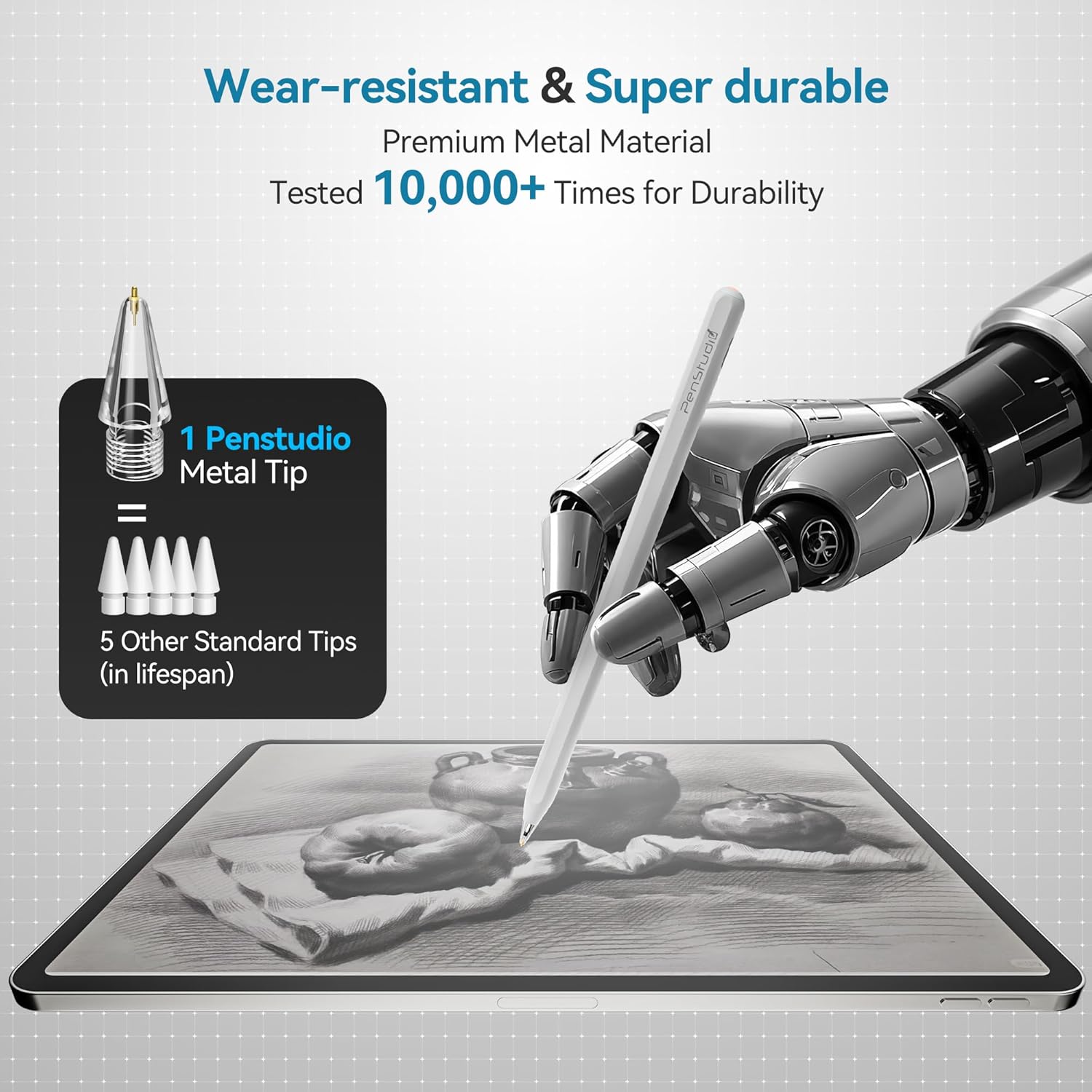 - 【Ultra-Durable Chrome Metal Tip – 18 Months Lifespan】Engineered to outlast standard tips, Penstudio’s metal replacement tips are tested over 10,000+ uses and built to last up to 18 months. One tip equals 5 standard tips in lifespan, reducing the need for frequent replacements. Perfect for digital artists, note-takers, and professionals seeking reliable performance.