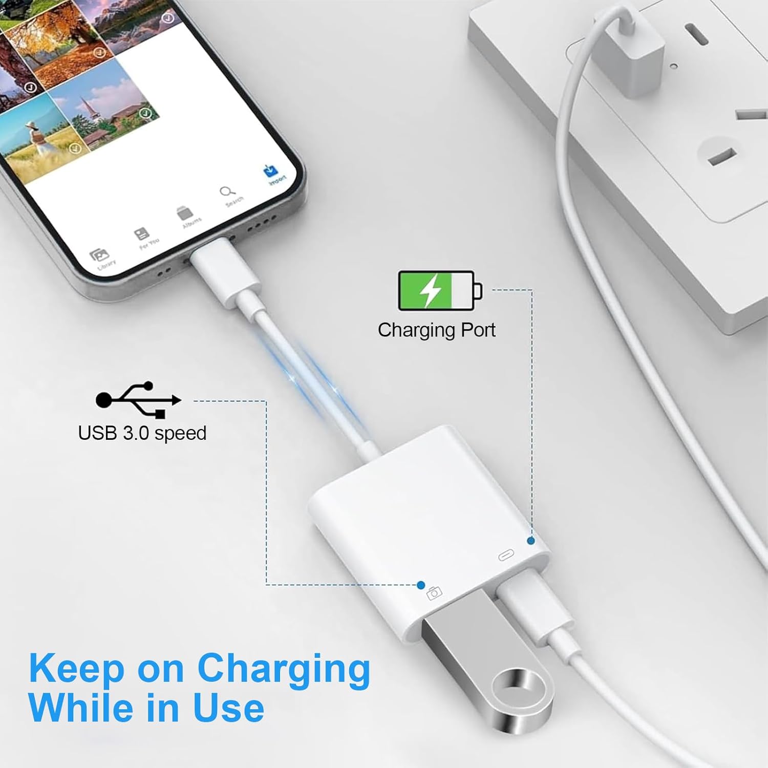 Lightning to USB Camera Adapter for iPhone, [Apple MFi Certified] USB3.0 Female Adapter for iPad with Charging Port, Plug and Play OTG Converter Support Card Reader USB Flash Drives Keyboard