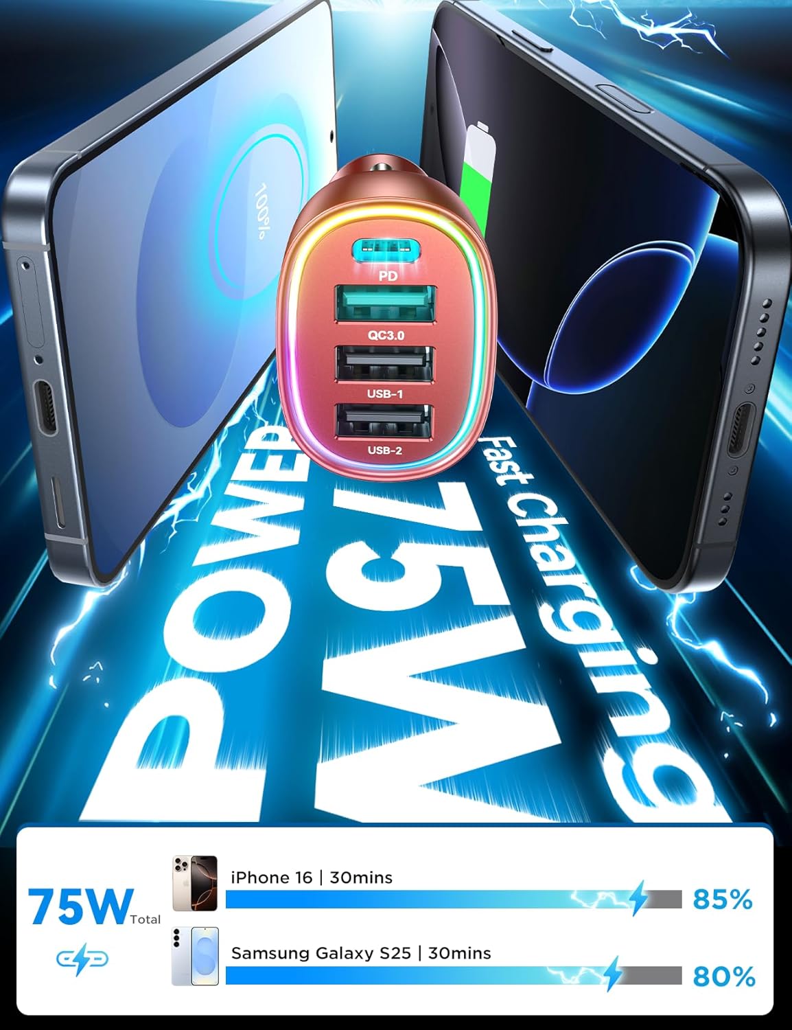 - Rapid Charging for All Devices Upgrade Your Ride: This cigarette lighter USB charger combines PD3.0 (60W) + QC3.0 (18W) tech. Charge iPhone 16 to 89% in 40 mins. Your ultimate fast charger for the road