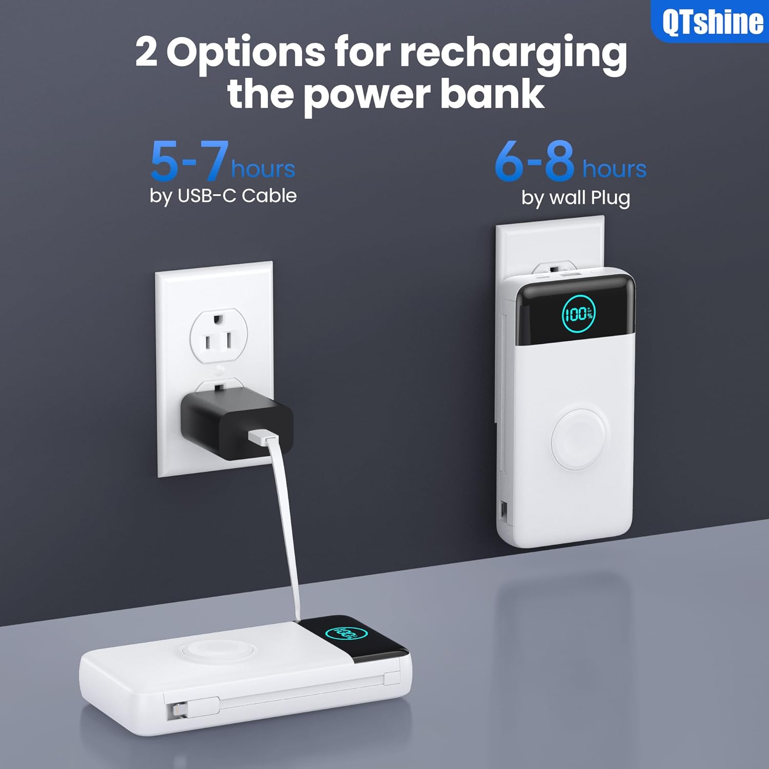 - 40800mAh Portable Charger with Built-in 2 USB cables for all iPhone series and iWatch Charger, the AC Wall plug built in allows you to recharge itself directly.You donβt need to carry adapter and cables everywhere any more.Easily track the status of your charge on LED Digital Display;