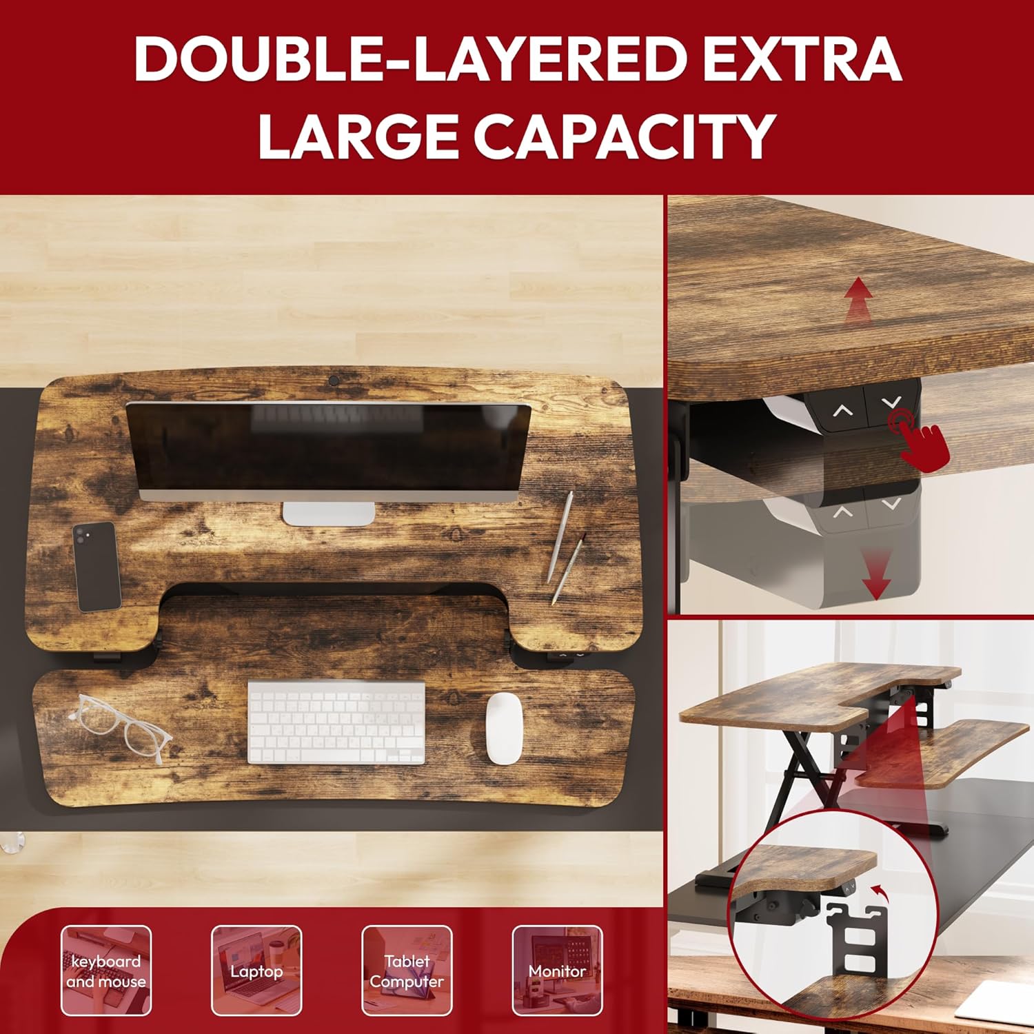 - Dual-tier desktop aesthetics: spacious upper desktop for dual monitors or laptop and monitor, spacious lower design for standard keyboard and mouse or 13-inch laptop, as well as other office supplies, great for mobile workstations