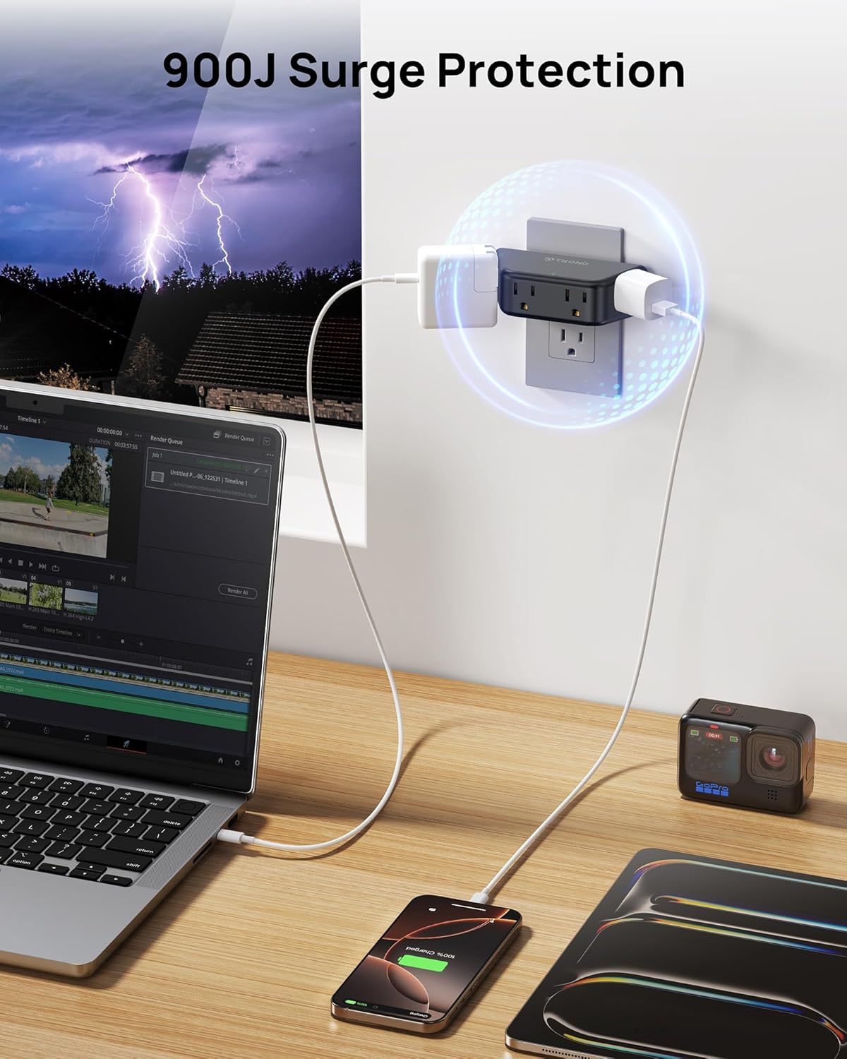 - Surge Protector Outlet Extender: This plug extension outlet features 900J surge protection to safeguard your devices from voltage spikes and electrical surges. It is constructed with top-grade UL94 V-0 flame-retardant material, ensuring both safety and durability