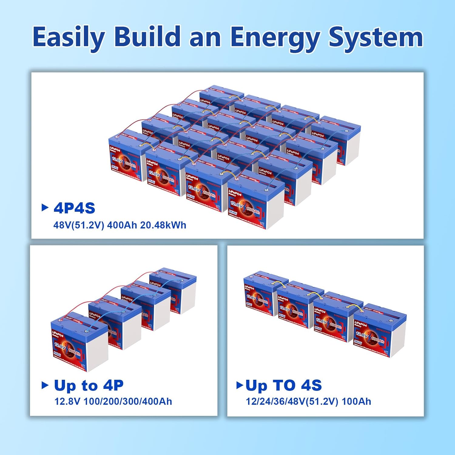 - 【20.48kWh Max. Energy】Marsenergy 12 volt lithium batteries support parallel and series connection to expand their capacity or voltage (up to 4 series and 4 parallels). The batteries system can be 51.2V(48V) 400AH, with a maximum energy of up to 20.48kWh